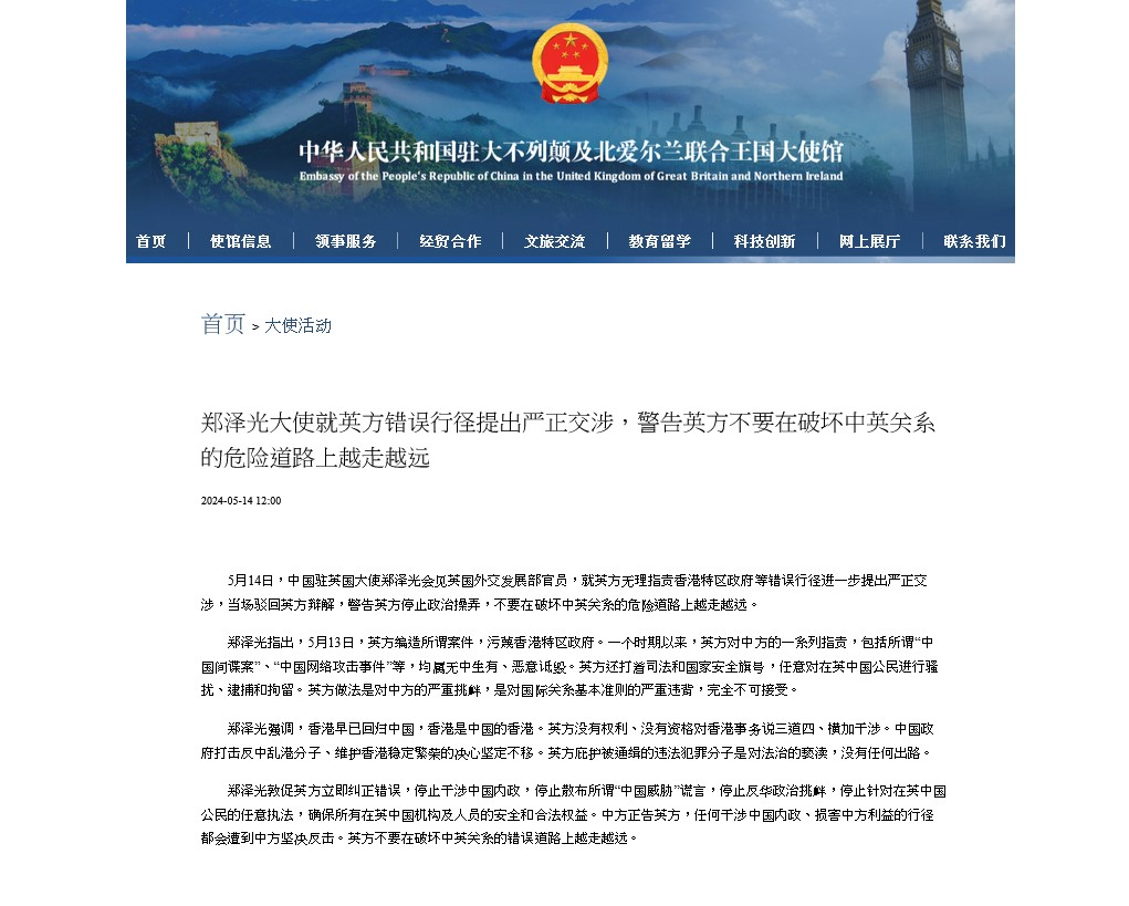 英國政府當地周二傳召鄭澤光,指出中國最近針對英國的行為模式,不可接受。