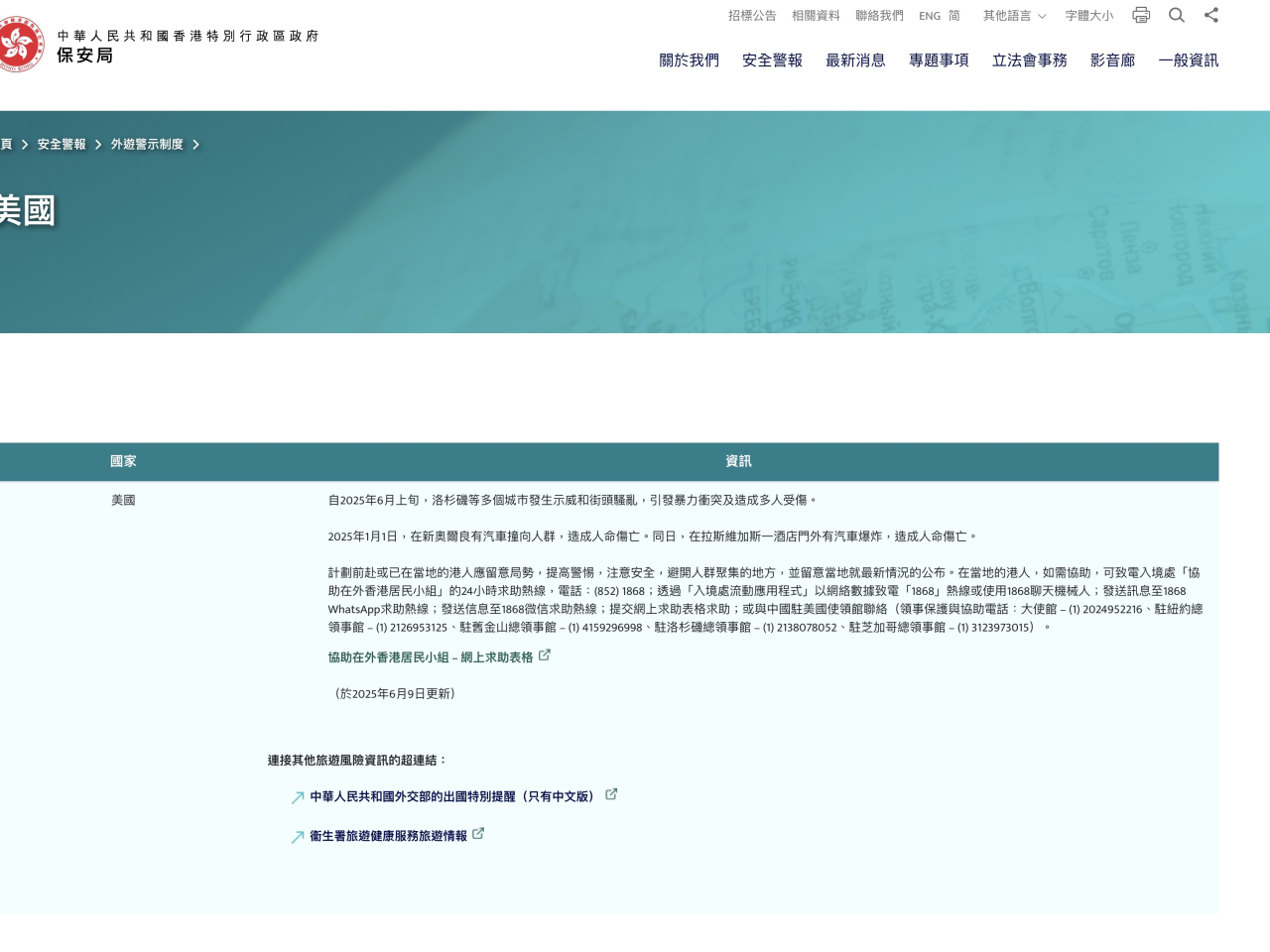 保安局已更新外遊警示網頁有關美國的附加資料,新增自2025年6月上旬,洛杉磯等多個城市發生示威和街頭騷亂,引發暴力衝突及造成多人受傷。