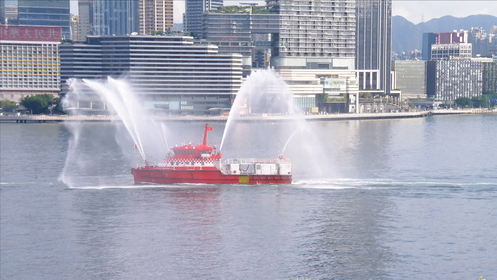 升起國旗及區旗後,紀律部隊的直升機飛越上空及有消防船在海上噴水敬禮。