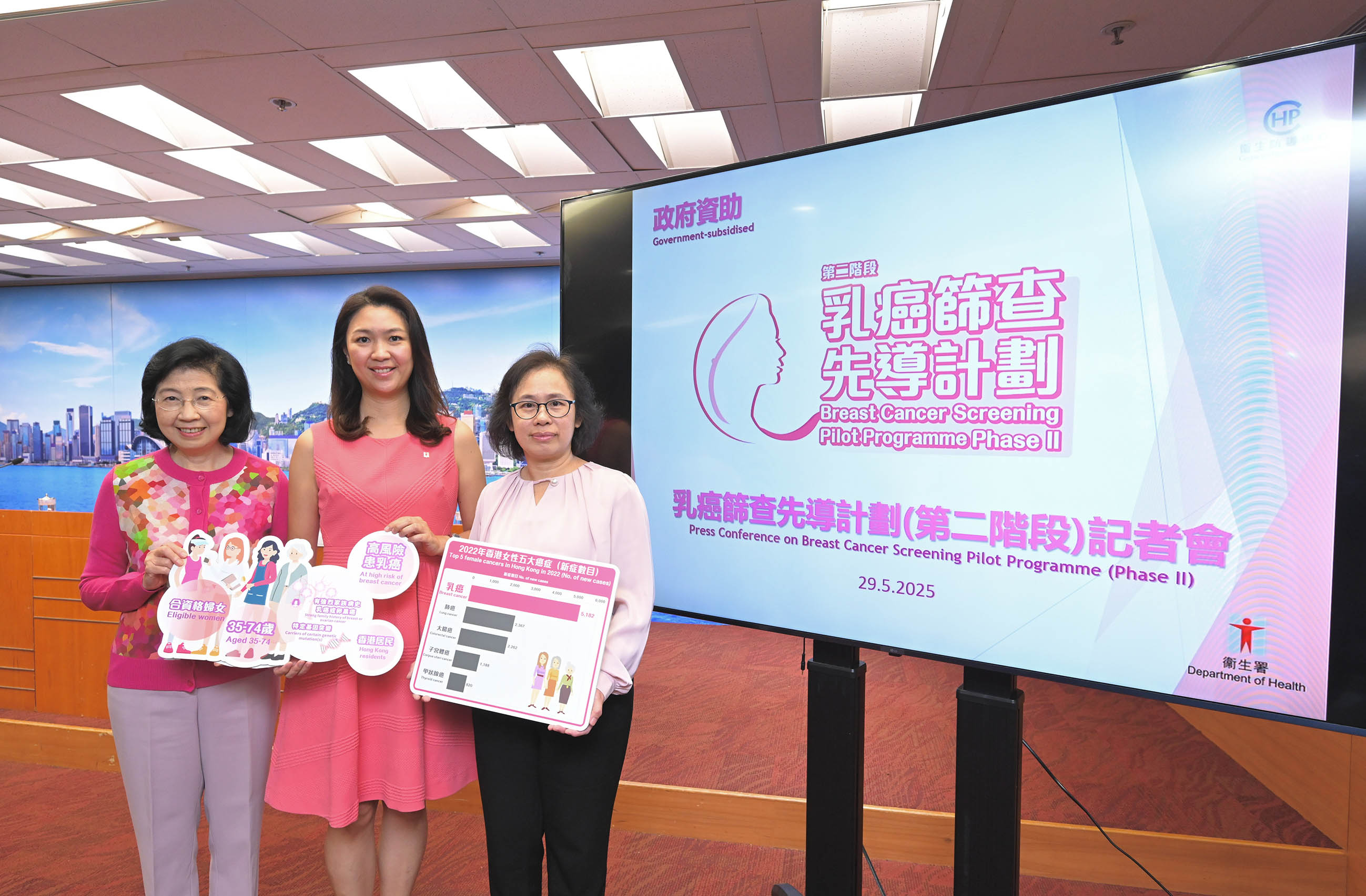 衞生署在2021年推出的乳癌篩查先導計劃,在2021至2024年,共有超過37000名年齡介乎44至69歲的中風險及一般風險女性,接受乳癌風險評估。先導計劃顯示通過乳癌篩查確診的患者,97%為早期癌症。 乳癌風險評估及篩查已於去年納入衞生署的婦女健康服務及長者健康服務,第二階段乳癌篩查先導計劃於今年6月展開,為年齡介乎35歲至74歲,並屬高風險罹患乳癌的香港女性居民,提供資助篩查服務。