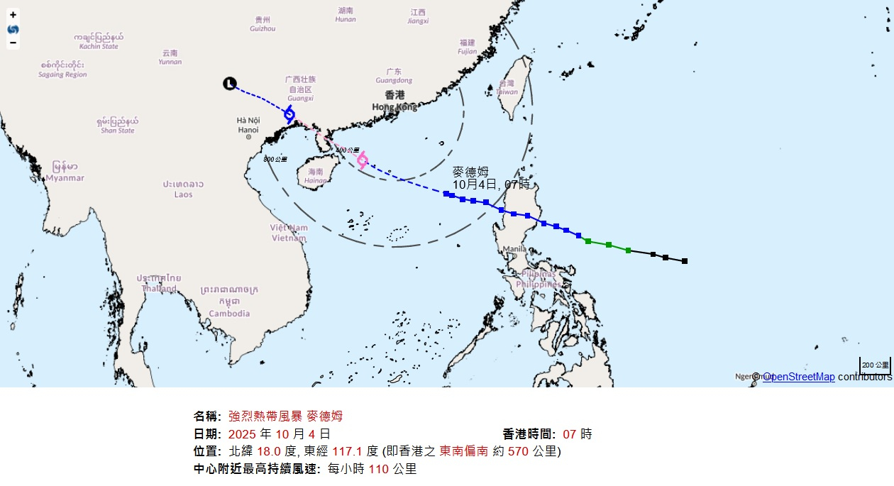 預料麥德姆會逐步增強並靠近雷州半島一帶。天文台將視乎麥德姆的強度、其烈風區與珠江口的距離及本地風力變化,評估是否需要在今晚改發更高熱帶氣旋警告信號。