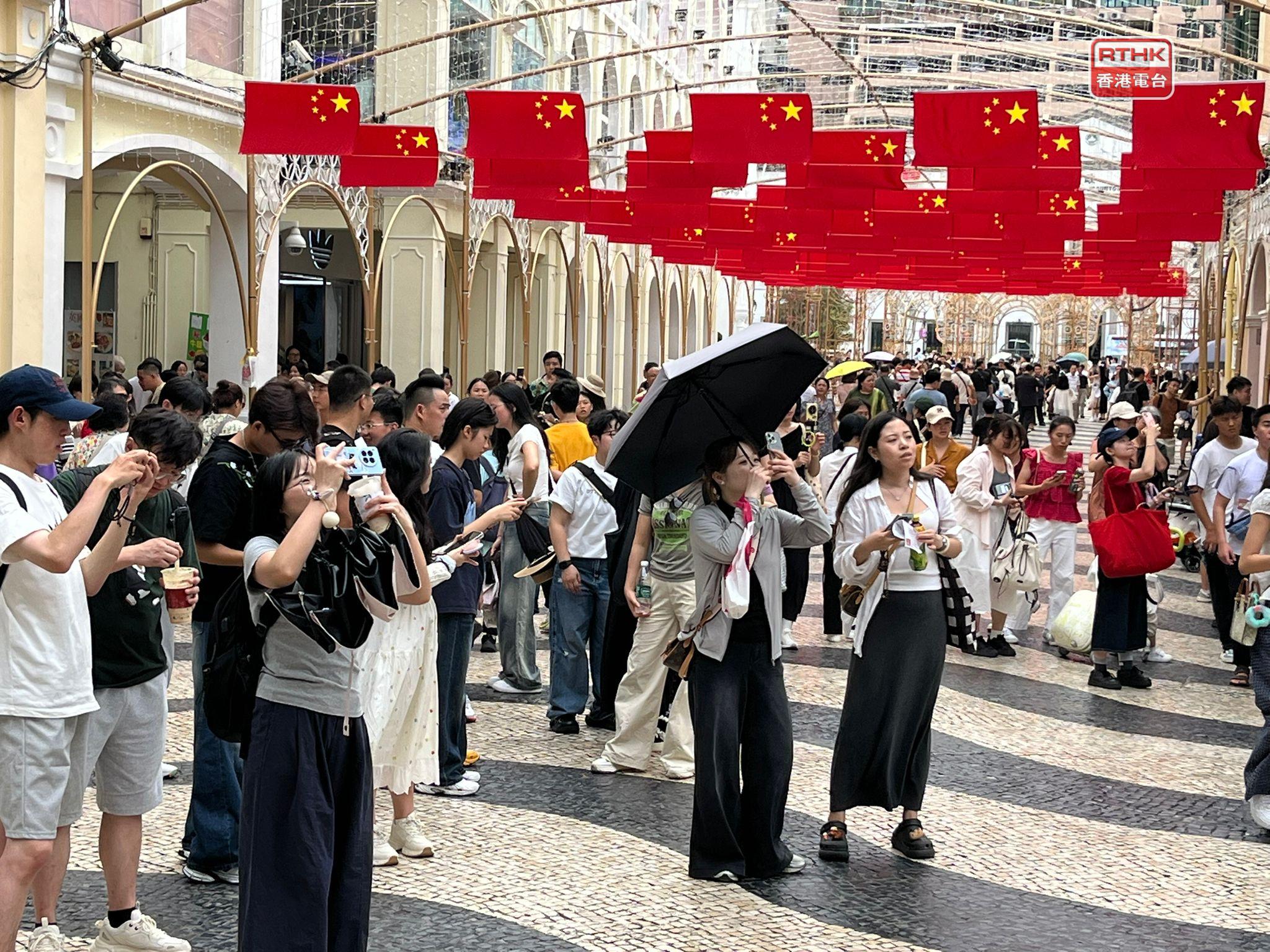 當局在景點大三巴附近採取的人潮管制下午結束,不少旅客仍在關前街一帶的行人專用區活動。(鄭月明攝)