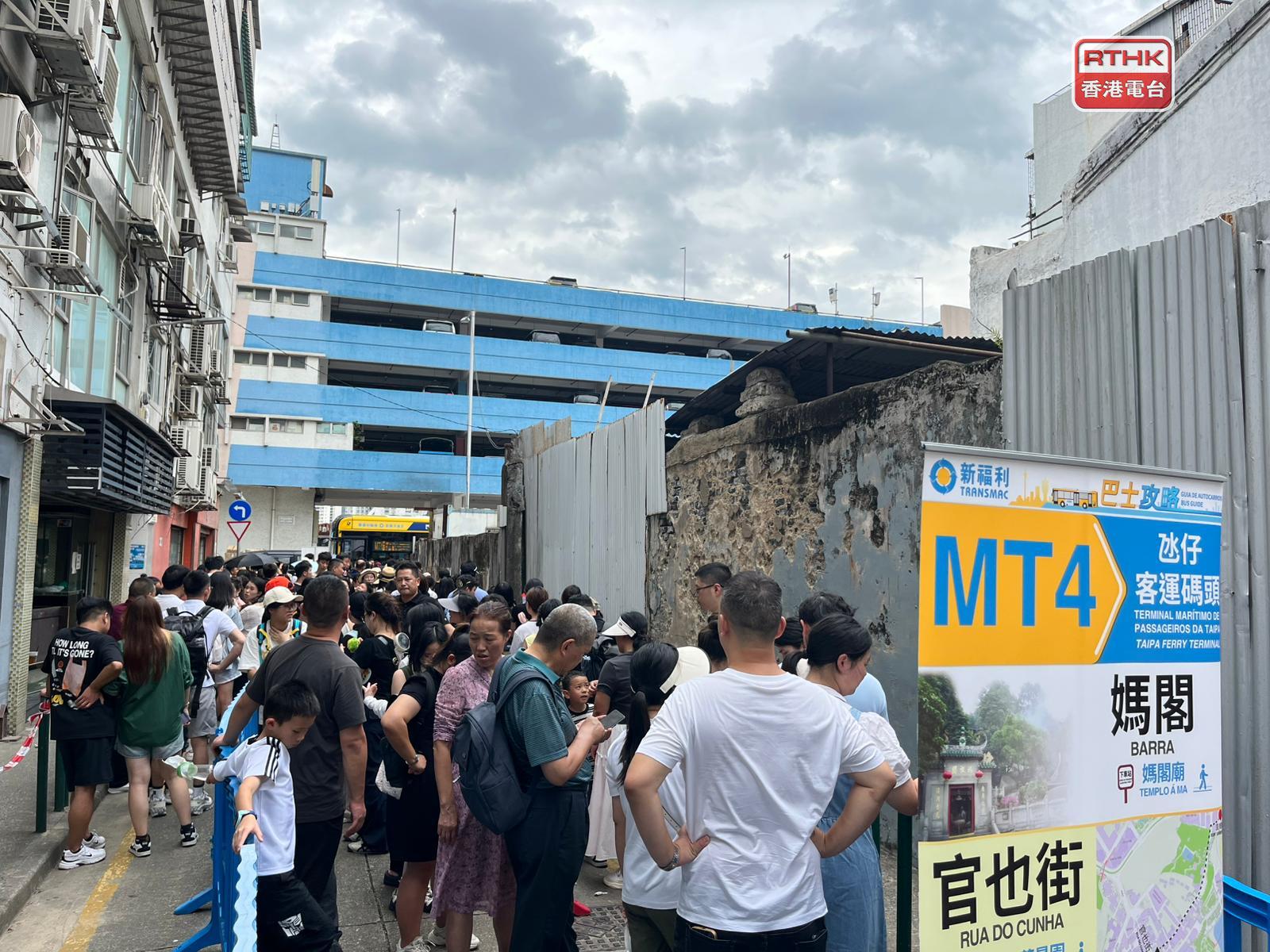 澳門下午大致天陰和酷熱,仍然無阻旅客行程。當局早前在景點大三巴附近採取人潮管制,到下午3時許結束。亦有旅客選擇在風雨來臨前,返回酒店或前往珠海,連接離島線的巴士站有不少旅客排隊等候。