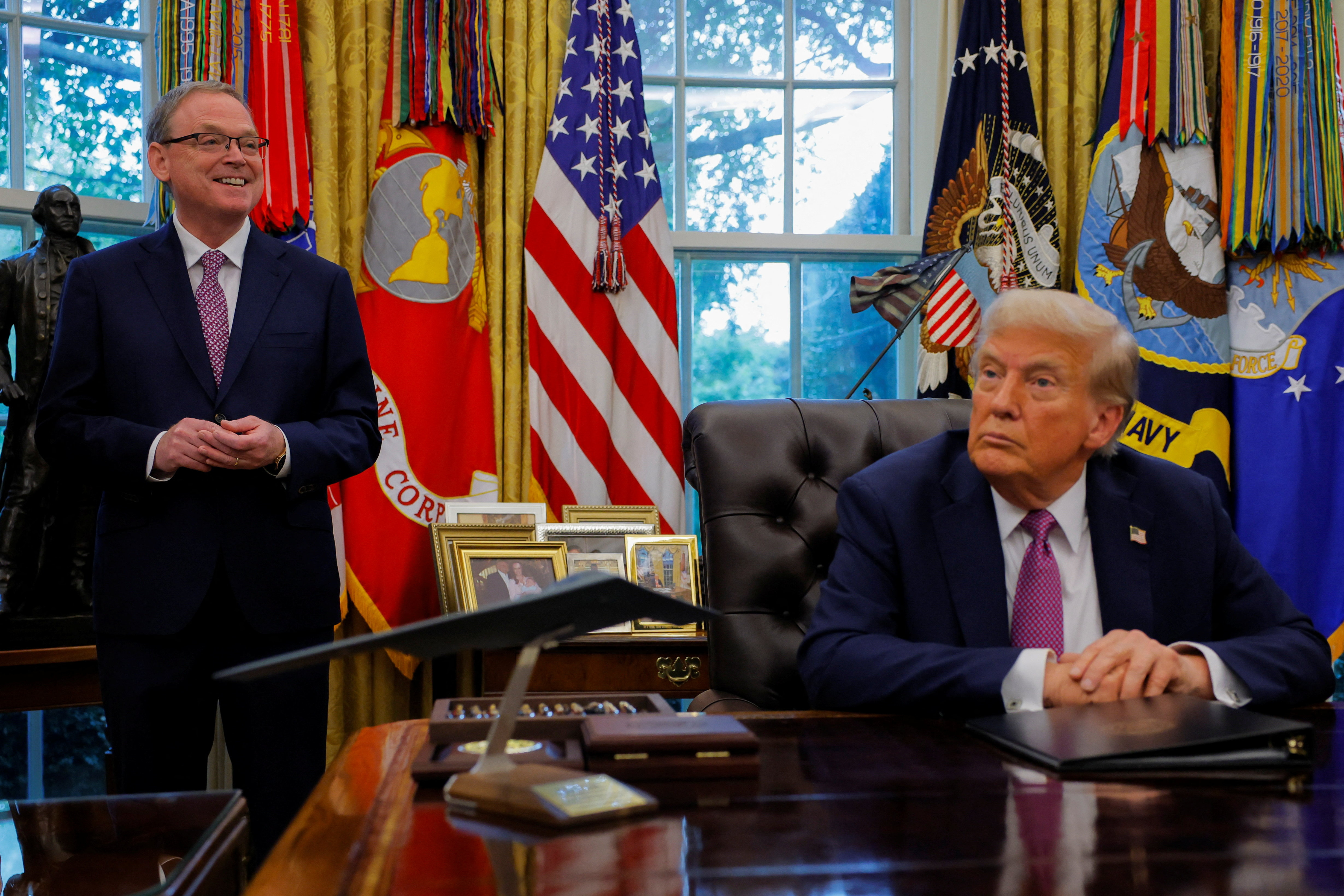 哈塞特(左)說,特朗普和白宮預算主管沃特準備在必要時採取行動。(路透社資料圖片)