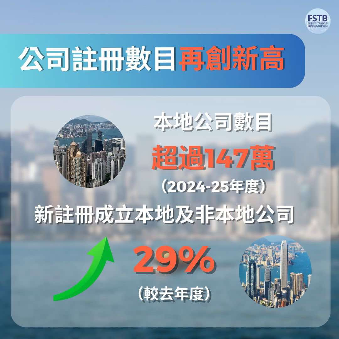 至今年3月底,香港有超過147萬間註冊本地公司;註冊成立的新公司按年上升29%至超過15.4萬間。