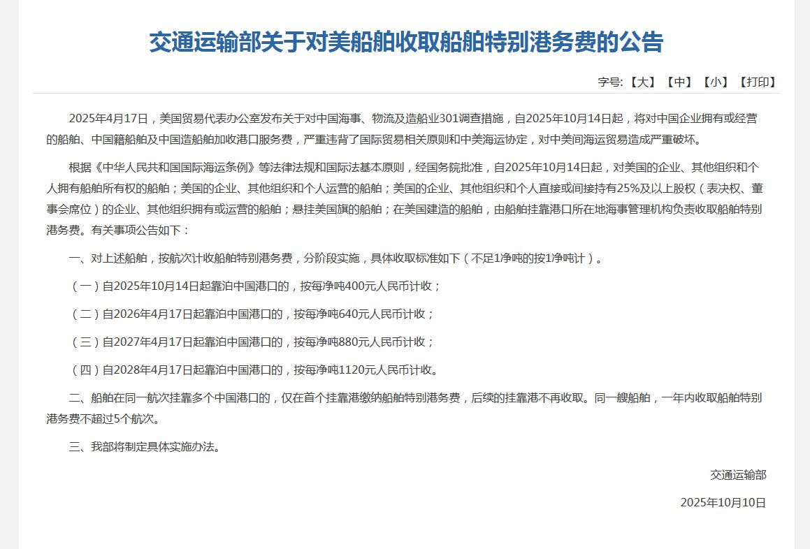 交通運輸部新聞發言人回應記者提問時表示,根據《中華人民共和國國際海運條例》發布公告,10月14日、即下星期二起,對涉美船舶收取船舶特別港務費。