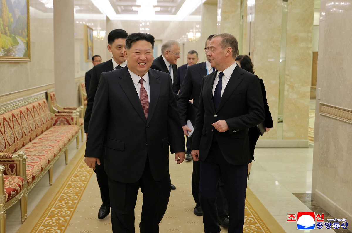 北韓勞動黨總書記、國務委員長金正恩昨日會見到訪的統一俄羅斯黨主席梅德韋傑夫。