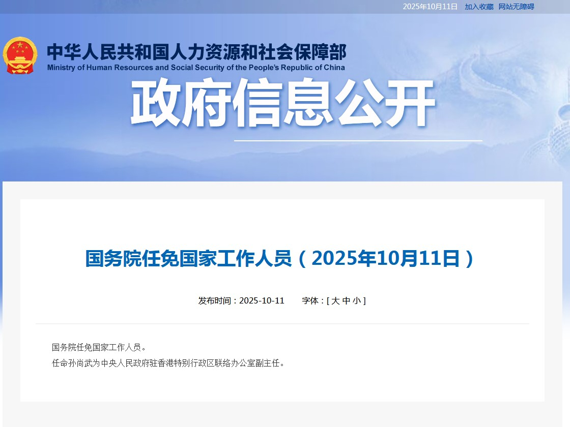 人力資源和社會保障部網站顯示,國務院任命孫尚武為中央人民政府駐香港特別行政區聯絡辦公室副主任。