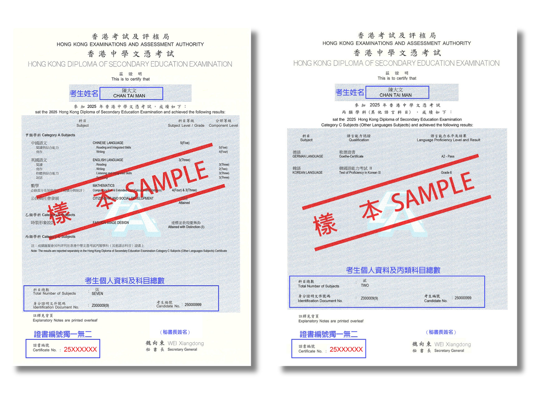 考評局指出,今年7月中放榜時每名考生均獲發成績通知書,但部分人經過成績覆核後,成績等級或會獲提升,DSE證書所印載的才是考生最終成績,是考生升學或就業的重要資歷憑證。此外,並非所有考生都會獲發證書,考生必須在最少一個科目考獲達標成績,才會獲發證書。當收到證書後應核對個人資料,如需更正,考生需填妥更正資料申請表格,連同證書一併交回考評局。