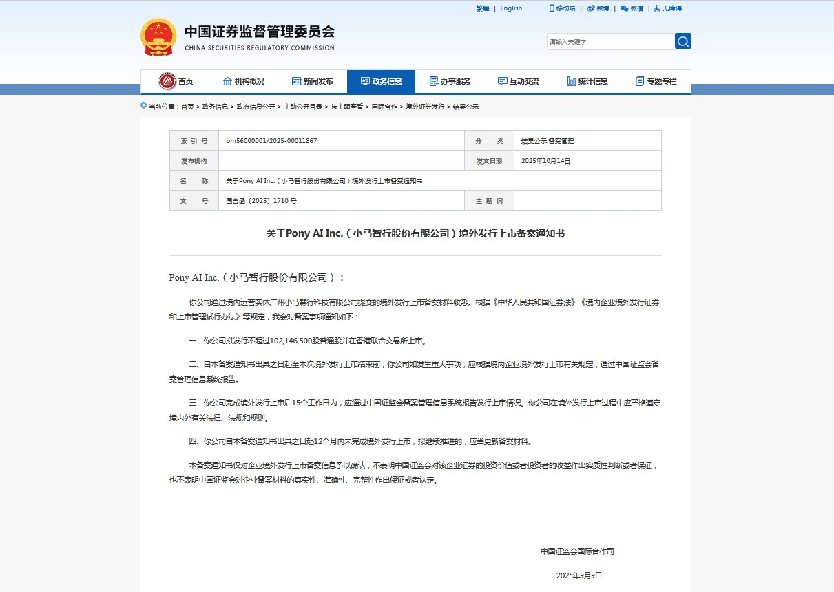 中國證監會文件顯示,小馬智行境外發行上市備案資訊得到確認。公司計劃發行約1.02億股境外上市普通股到香港聯交所上市。