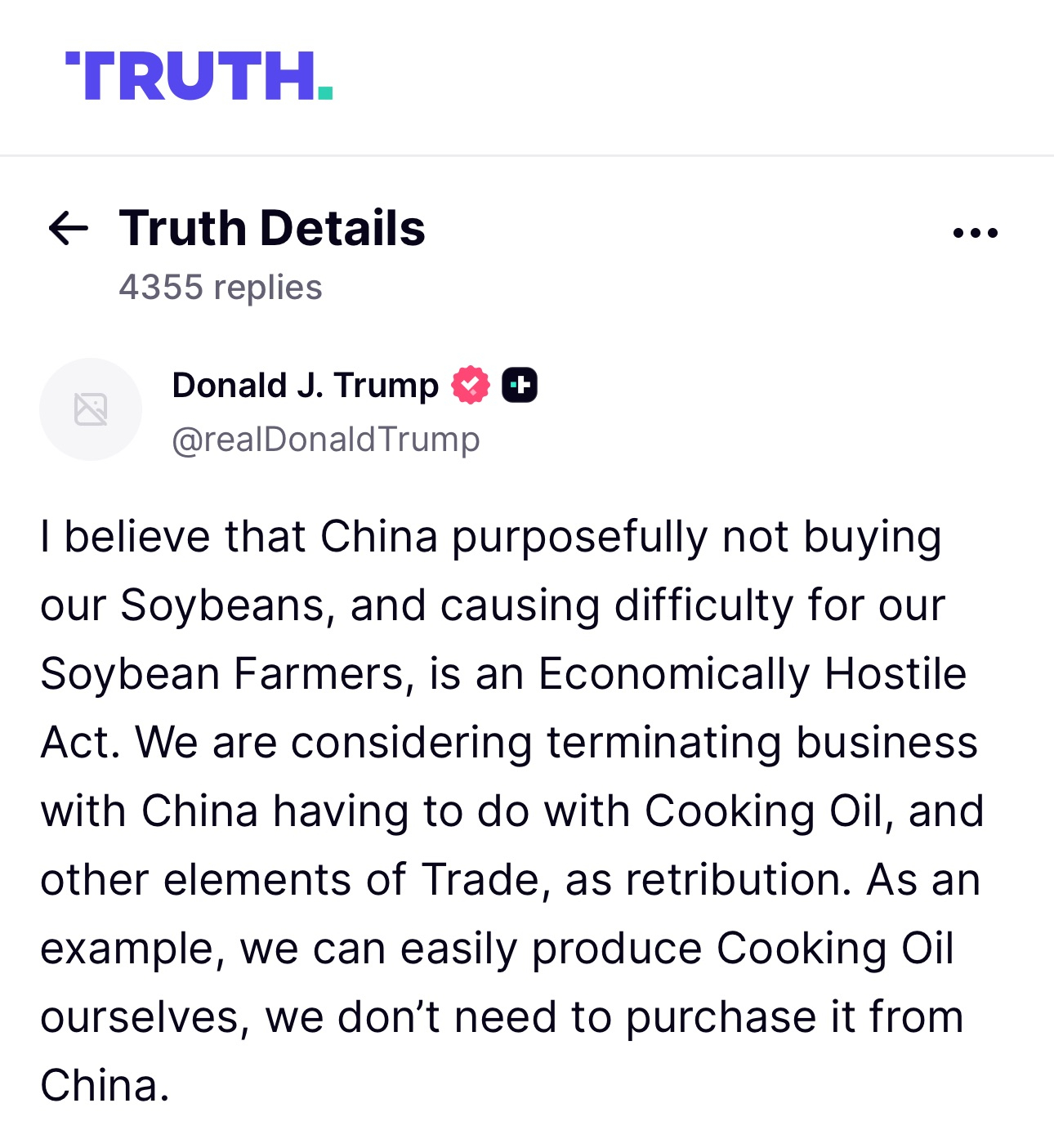 美國總統特朗普說,正考慮終止與中國的部分貿易,包括與食用油相關的貿易,指中國故意不買美國大豆,使美國豆農面對困難,是經濟敵對行為。