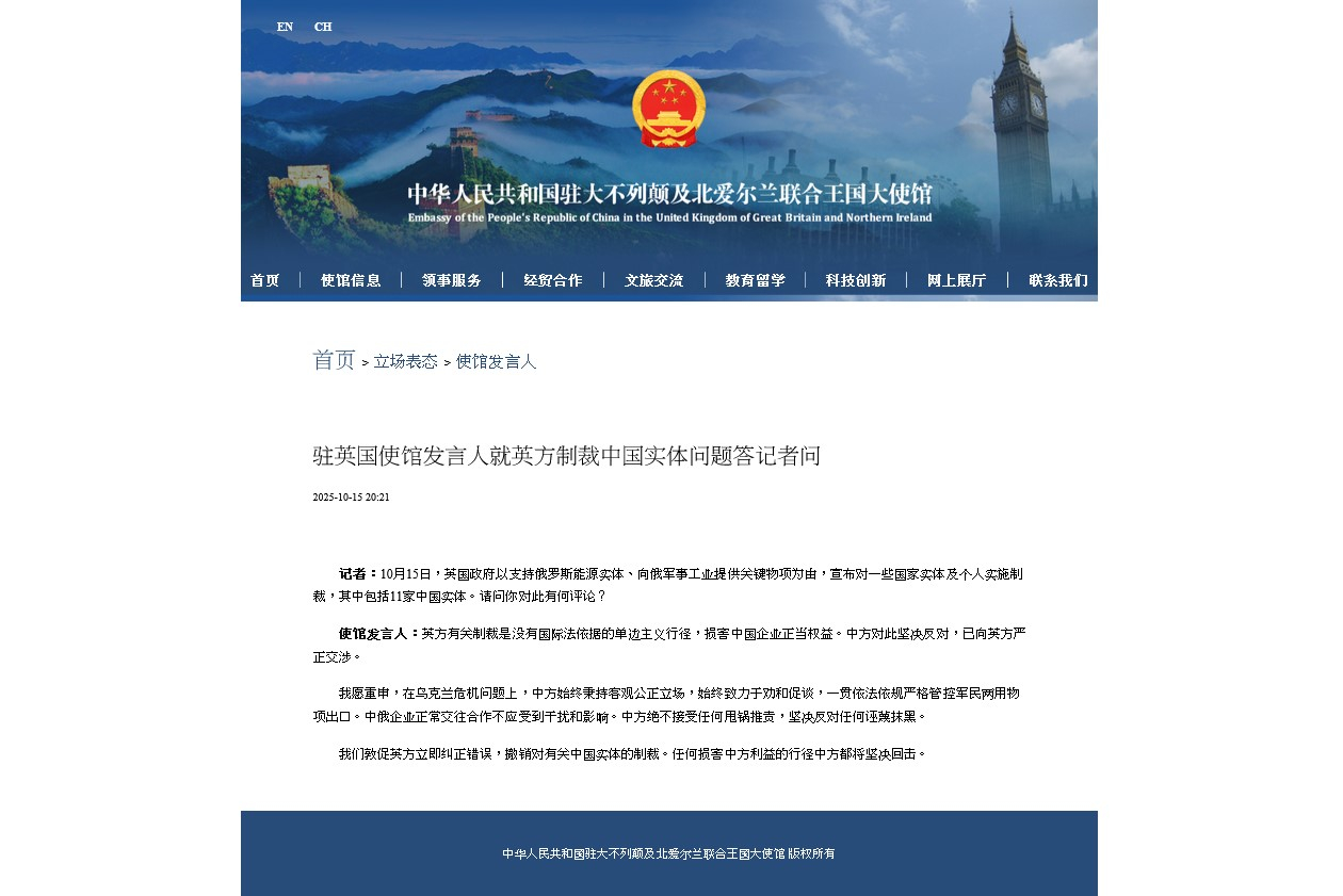 中國駐英國使館發言人表示,英方有關制裁是沒有國際法依據的單邊主義行徑,損害中國企業正當權益。中方對此堅決反對,已向英方嚴正交涉。中方敦促英方立即糾正錯誤,撤銷對有關中國實體的制裁。任何損害中方利益的行徑中方都將堅決回擊。