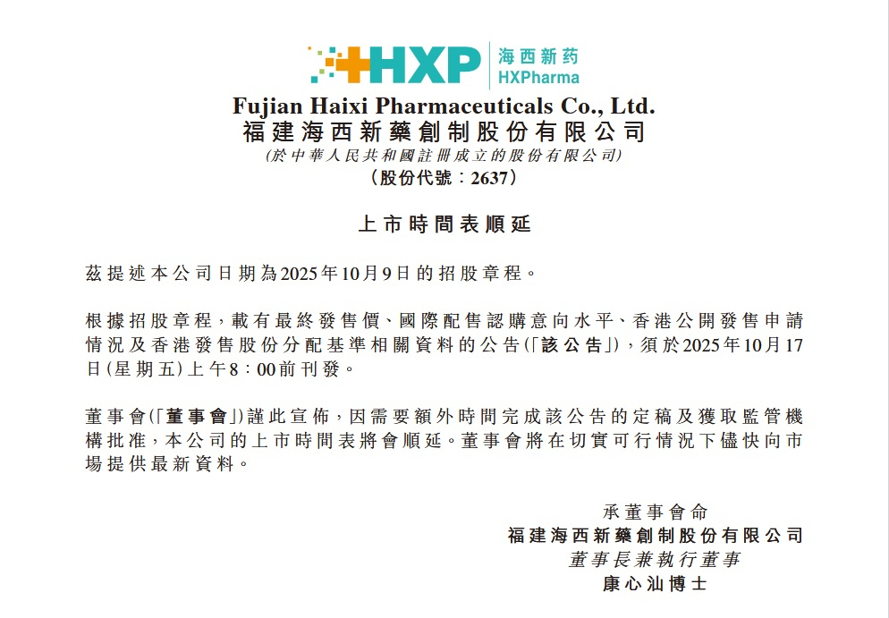 公告指,因需要額外時間完成載有最終發售價、國際配售認購意向水平、香港公開發售申請情況,及香港發售股份分配基準相關資料公告的定稿,及獲取監管機構批准,公司的上市時間表將會順延。公司將在切實可行情況下儘快向市場提供最新資料。