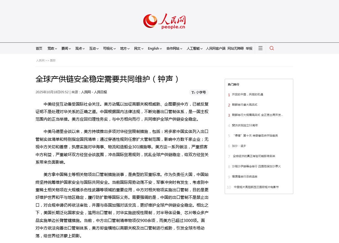 文章表示,中國根據國內法律法規,不斷完善出口管制體系,是一國主權範圍內的正當舉措。美方應回歸理性務實,與中方相向而行,共同維護全球產供鏈安全穩定,又指維護健康的國際經貿秩序及全球產供鏈安全穩定,是各方共同的職責。