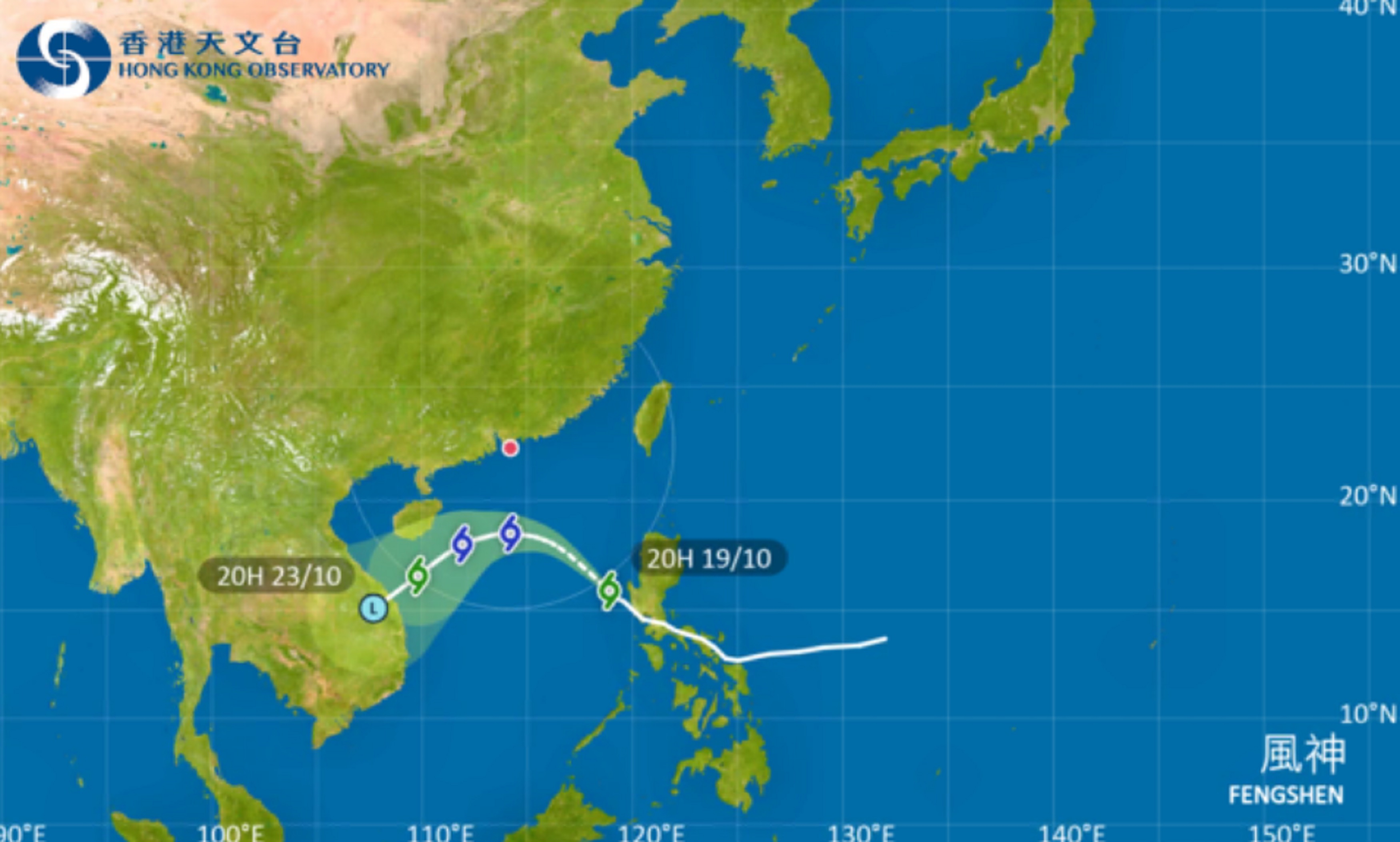 天文台表示熱帶氣旋風神今晚進入本港800公里範圍內。(天文台網頁圖片)