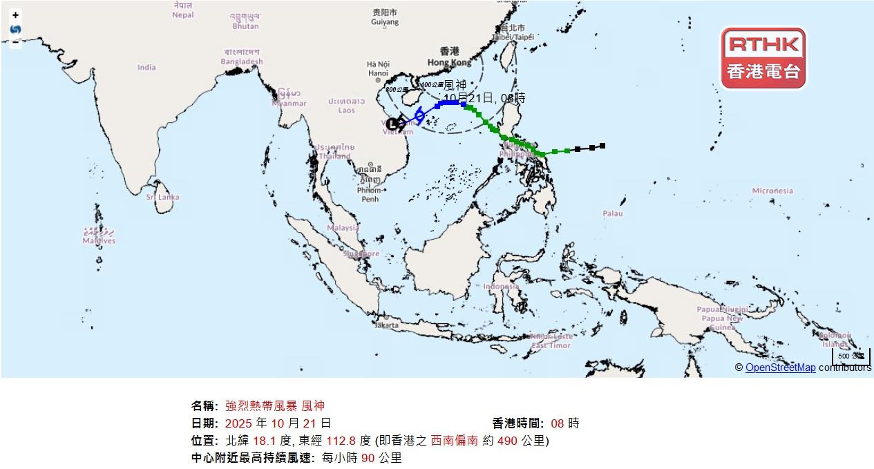 天文台表示,風神會在今日逐漸向西南方向移動並遠離香港。(天文台網頁)
