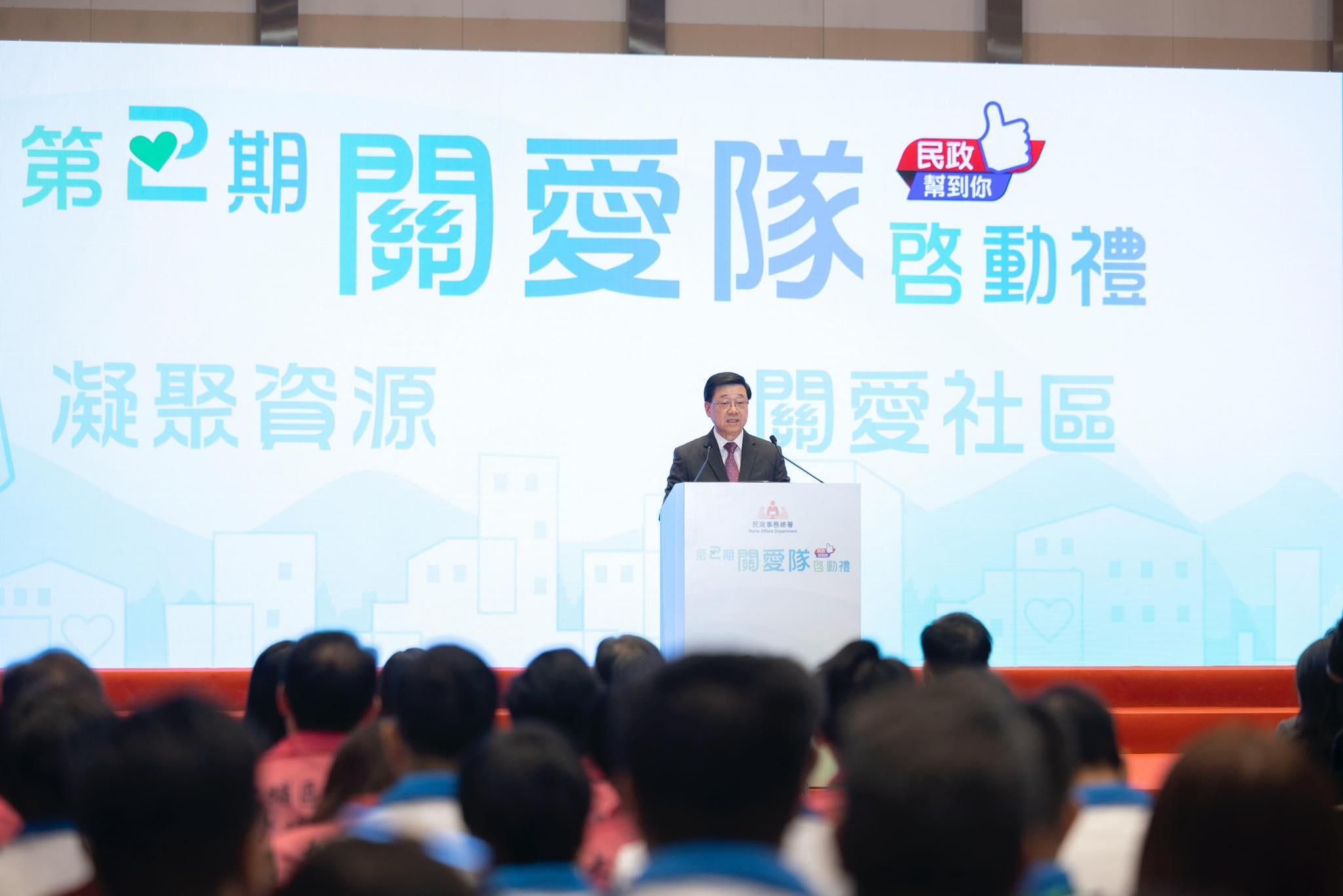 民政事務總署舉行第二期地區服務及關愛隊伍啓動禮,行政長官李家超說,在恆常化運作模式及增加政府資助下,關愛隊在第二期服務開展時,將進一步優化社區支援網絡,並按地區需要新增三支關愛隊小隊,同時優化KPI。