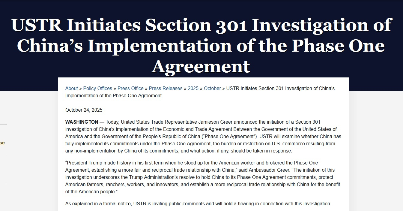 美國貿易代表辦公室表示,美中兩國在2019年達成具歷史意義的首階段協議,中方同意進行結構性改革,糾正在知識產權、技術轉移、農業和金融服務領域的扭曲性行為、政策和做法,協議亦要求中國大幅增加購買美國商品和服務。公告說,協議生效五年後,雖然美國多次與中國磋商,但中方似乎並未履行在協議下關於非關稅壁壘、市場准入問題及購買美國商品和服務的承諾。