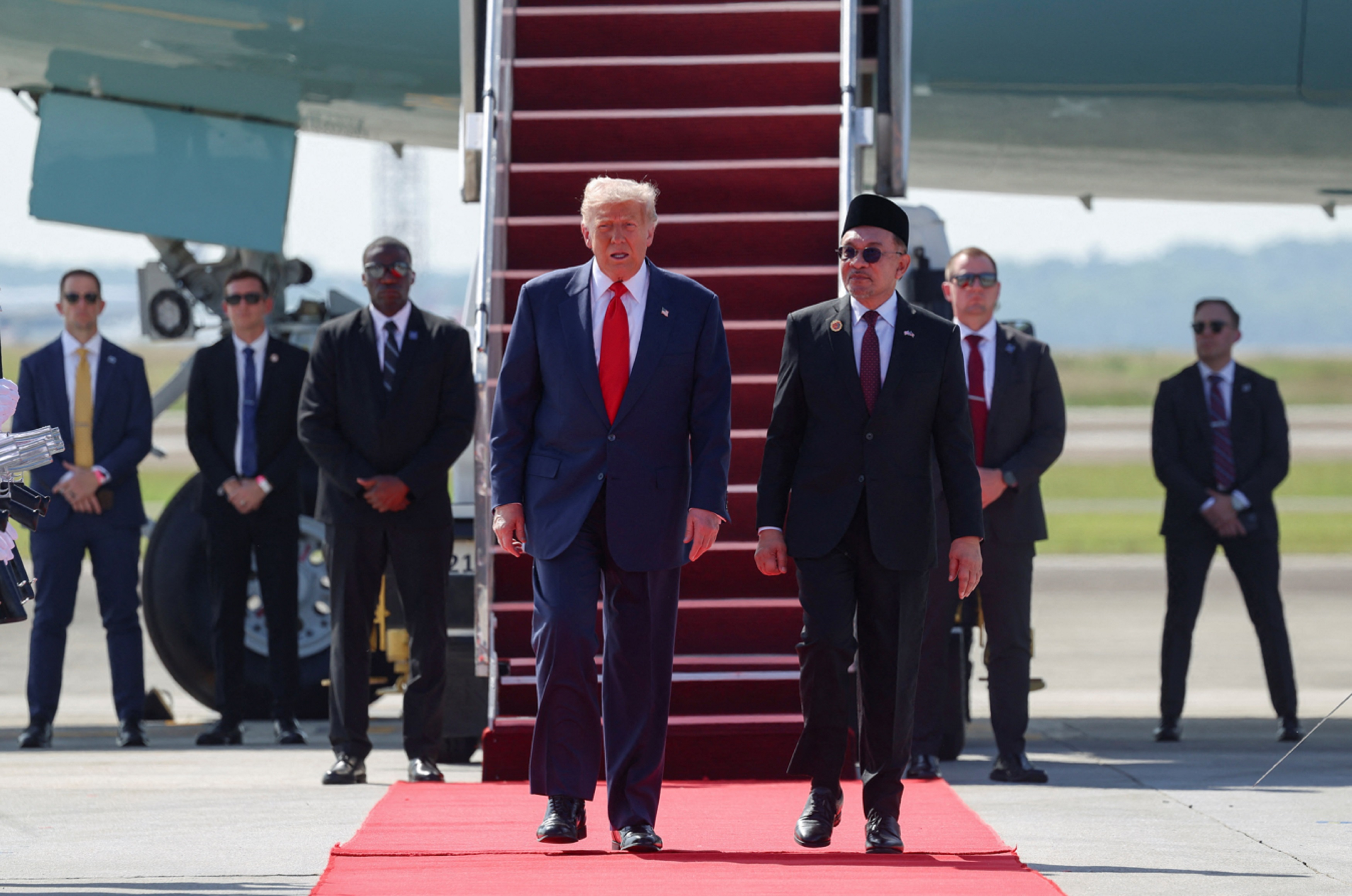 空軍一號降落後,特朗普步出機艙,馬來西亞總理安華在場迎接,特朗普與馬來西亞多名部長及其他政府高級官員握手。
