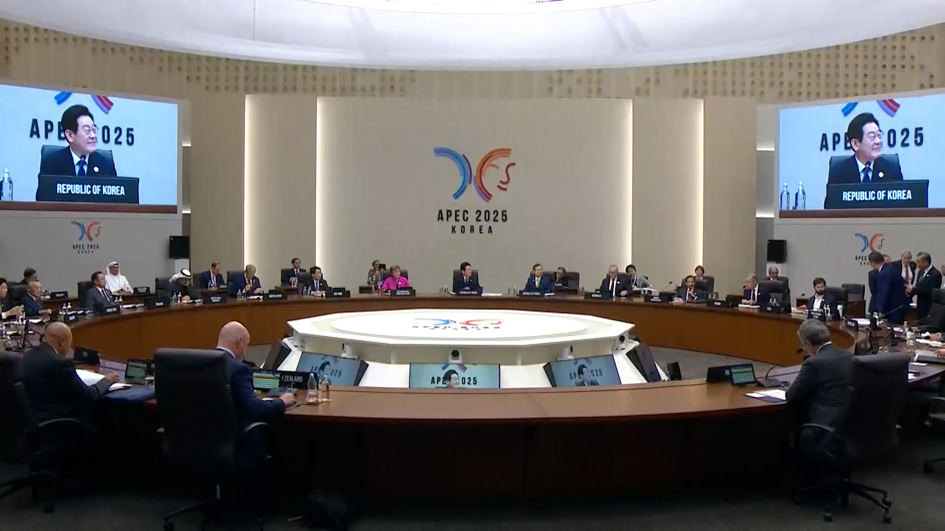 會議開始前,南韓總統李在明在會場門外,逐一與各經濟體領導人及代表握手,歡迎他們。習近平壓軸進場,與李在明一同步入會場。