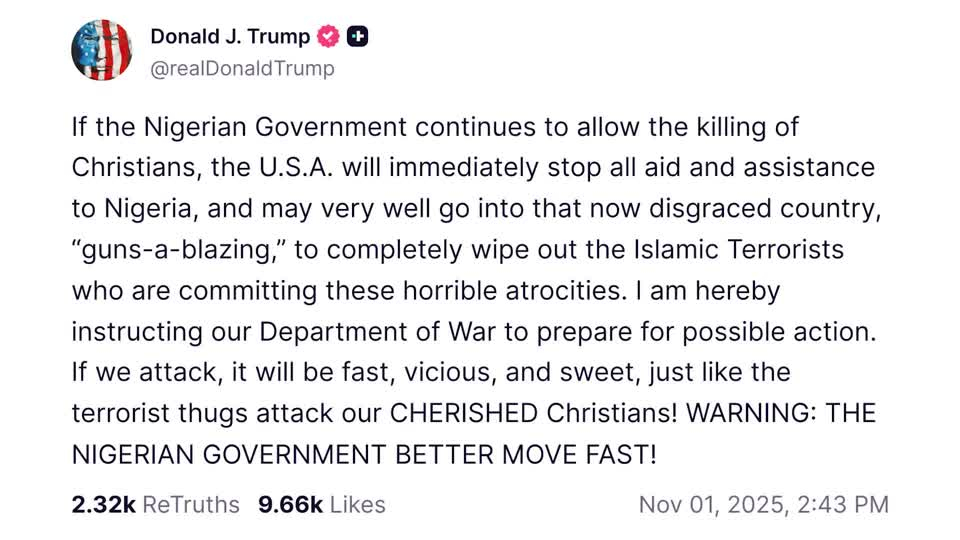特朗普日前將尼日利亞列為「特別關注國」,指基督教在當地面臨生存威脅。尼日利亞總統提努布強調,指責尼日利亞宗教不寬容並不反映實際,政府持續及真誠地保障所有人的宗教和信仰自由,憲法亦保障公民的信仰權利。