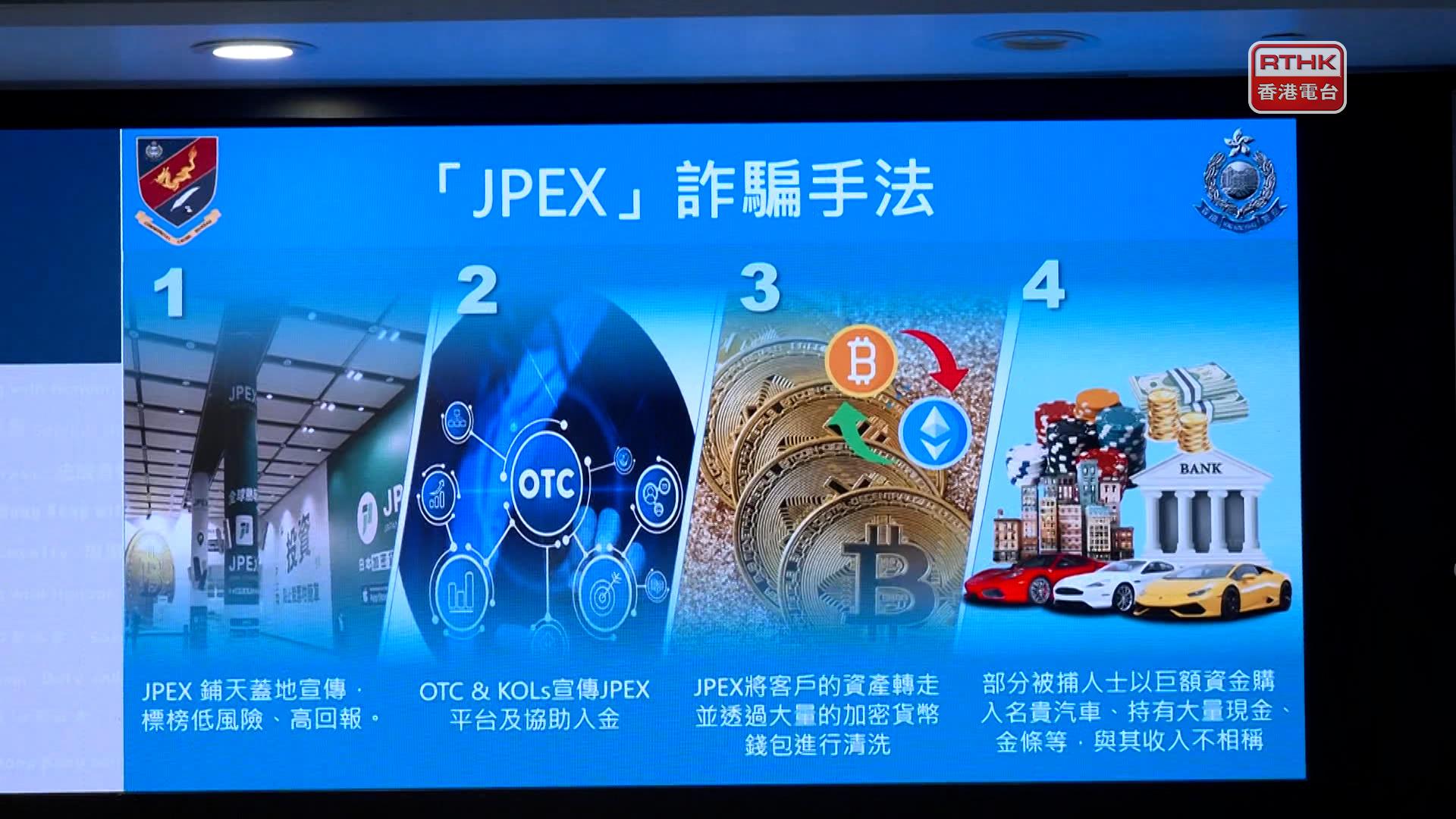 高級警司孔慶勳說,JPEX虛擬資產交易平台自2020年初設立,標榜低風險高回報,2023年證監會發出警告聲明後,JPEX大幅提高手續費,令到投資者無法提款,JPEX 及後將客戶資產以加密錢包方式清洗款項。她表示,案件極之複雜,從來沒有公司或個人承認為真正營運者。警方在過去兩年,向大量事主及證人調查及錄取口供,翻查公司註冊文件及交易記錄、法證檢測及蒐集證據等。