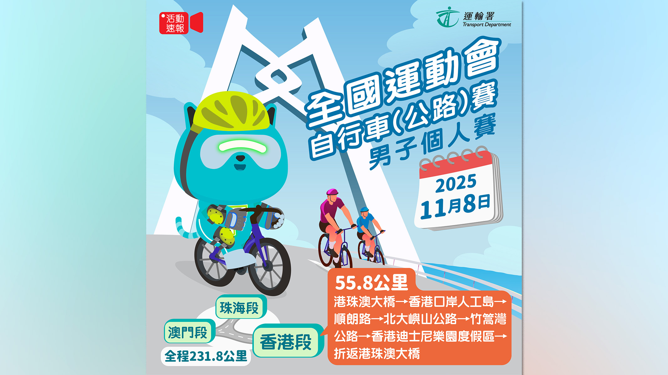 十五運會的公路自行車男子個人賽明天在粵港澳三地舉行。運輸署提醒市民,將因應賽事,實施臨時交通管制及口岸通關特別安排,相關跨境及接駁口岸的本地公共運輸服務亦會調整或暫停。