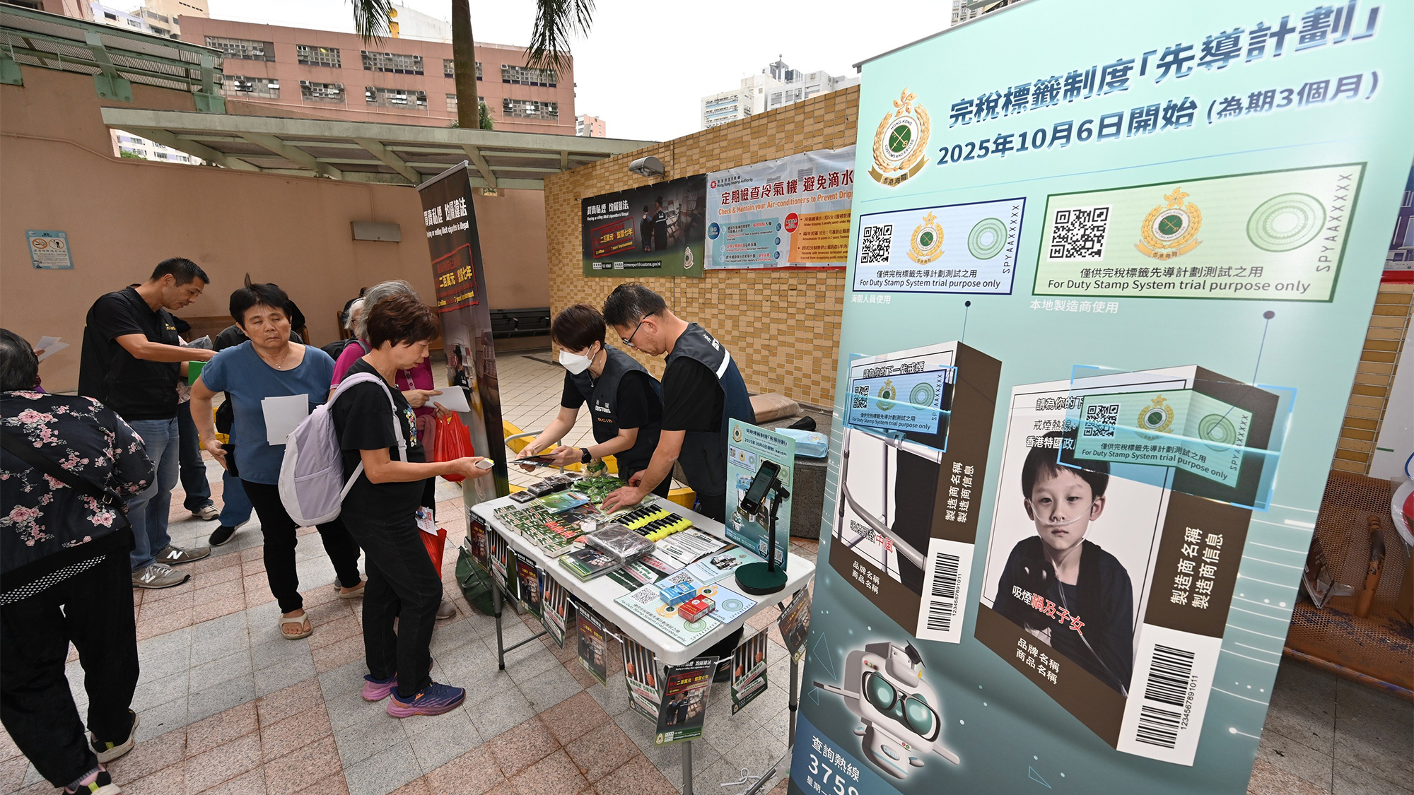 海關人員向居民派發宣傳品和講解反私煙信息。(政府新聞處)