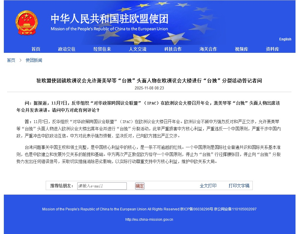 中國駐歐盟使團表示,歐洲議會不顧中方強烈反對和嚴正交涉,允許蕭美琴等「台獨」頭面人物進入歐洲議會大樓,出席反華組織「對華政策跨國議會聯盟」年會並進行「台獨」分裂活動,中方表示強烈憤慨、堅决反對,已向歐方提出嚴正交涉,指做法嚴重損害中方核心利益,嚴重違反一個中國原則,嚴重干涉中國內政,嚴重衝擊中歐政治互信。
