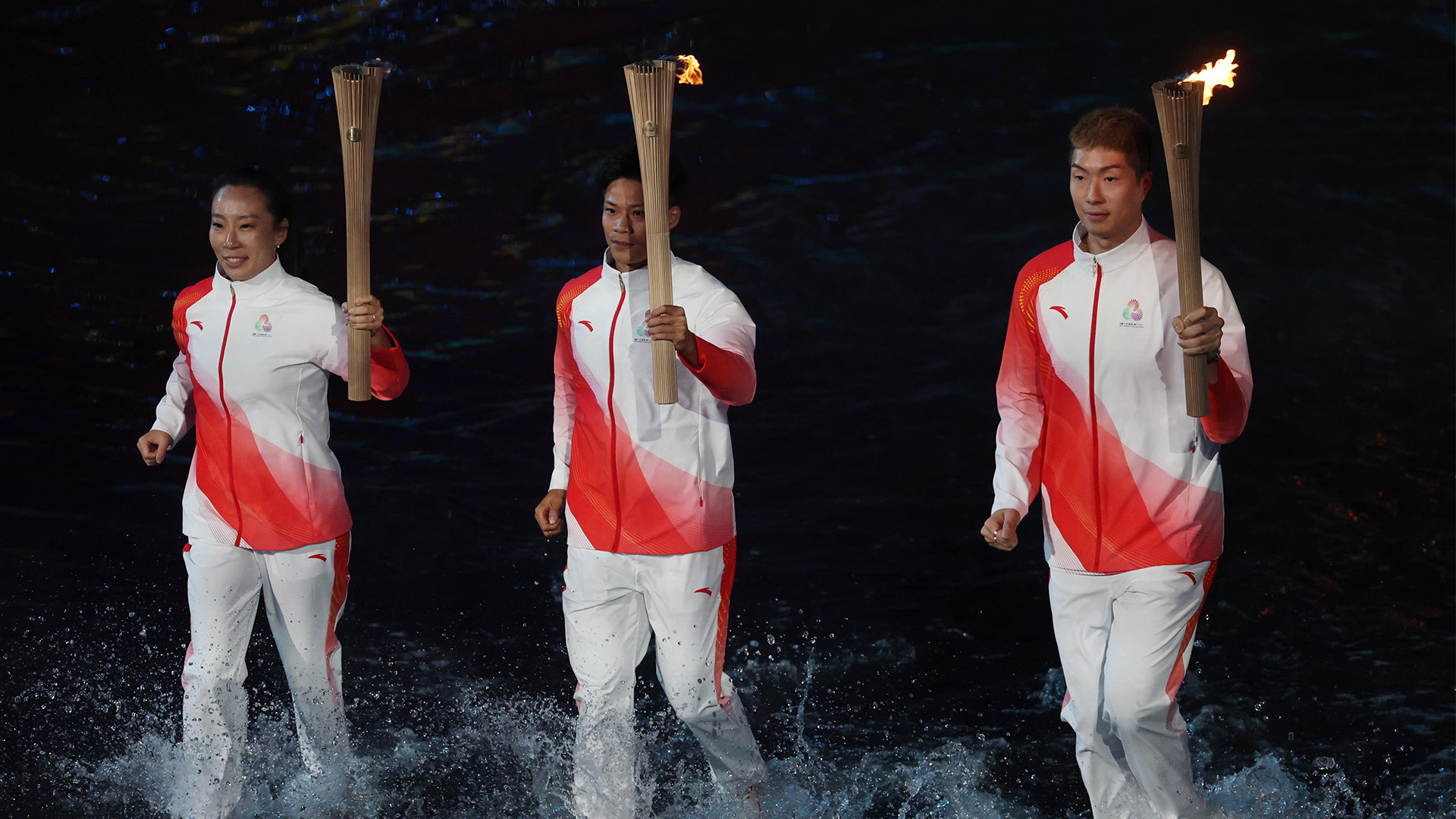 全運會火炬在開幕式場內傳遞,多名體育名將參與,包括乒乓球的馬琳、跳水的陳若琳和郭晶晶,以及本港單車運動員黃金寶。港隊劍擊代表、奧運金牌得主張家朗,廣東百米亞洲紀錄保持著蘇炳添及澳門的亞運武術長拳金牌得主李禕,涉水接最後一棒,寓意從南海過千米深處採集聖火,三人慢跑上台共同點燃主火炬。