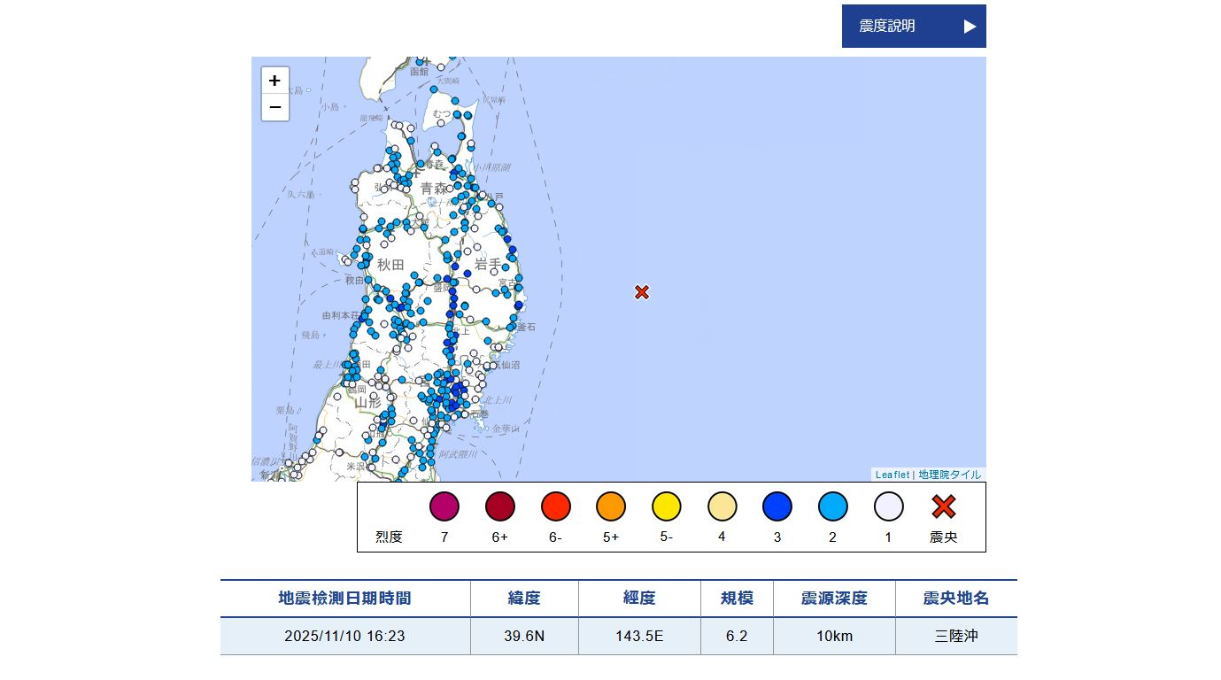 日本岩手縣對開海域下午發生6.2級地震。(日本氣象廳網頁截圖)