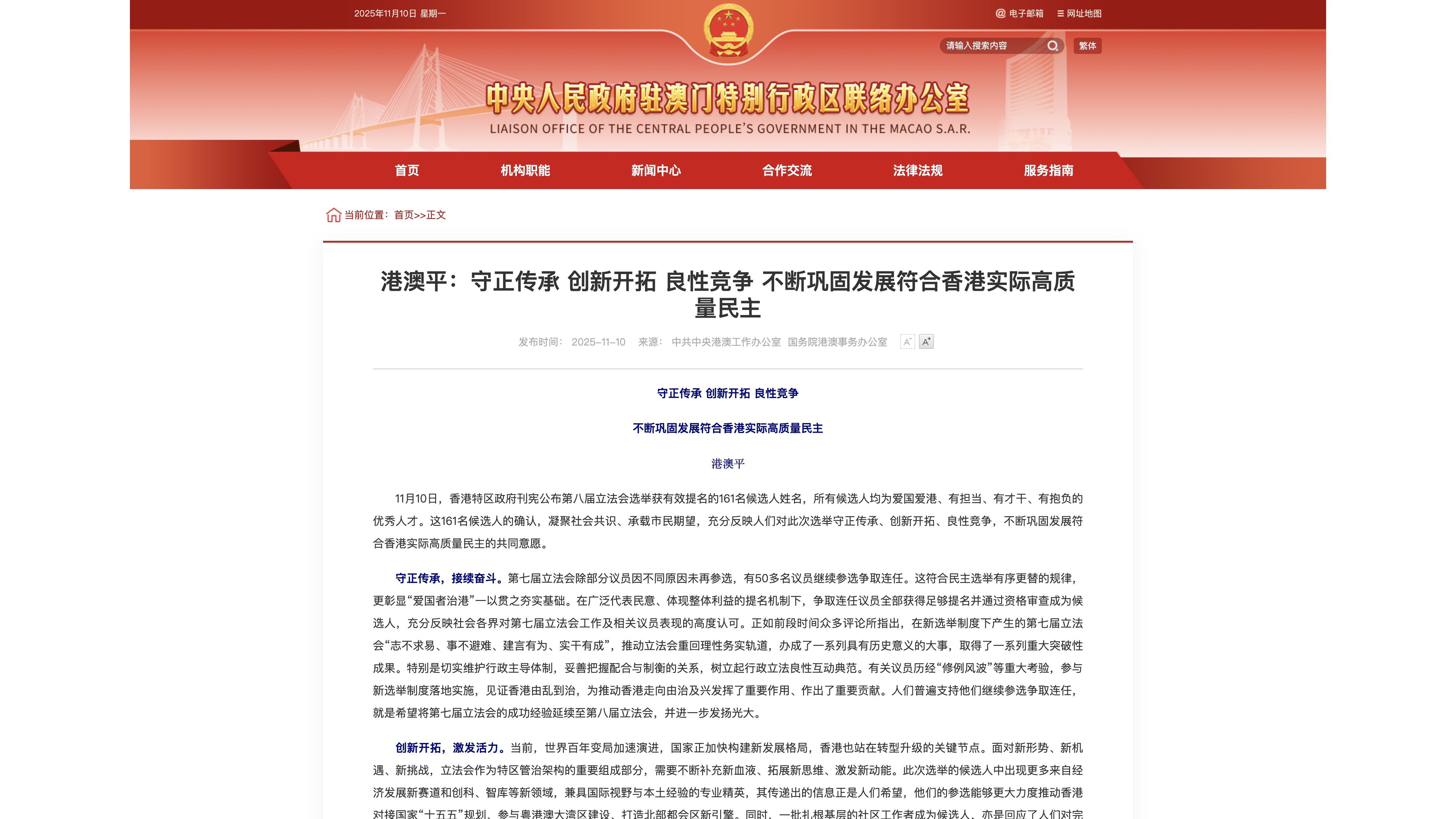 候選人資格審查委員會裁定立法會選舉全部161名參選人提名有效,港澳辦以「港澳平」發表署名文章表示,161名候選人的確認,凝聚社會共識、承載市民期望,充分反映人們對此次選舉守正傳承、創新開拓、良性競爭,不斷鞏固發展符合香港實際高品質民主的共同意願。
