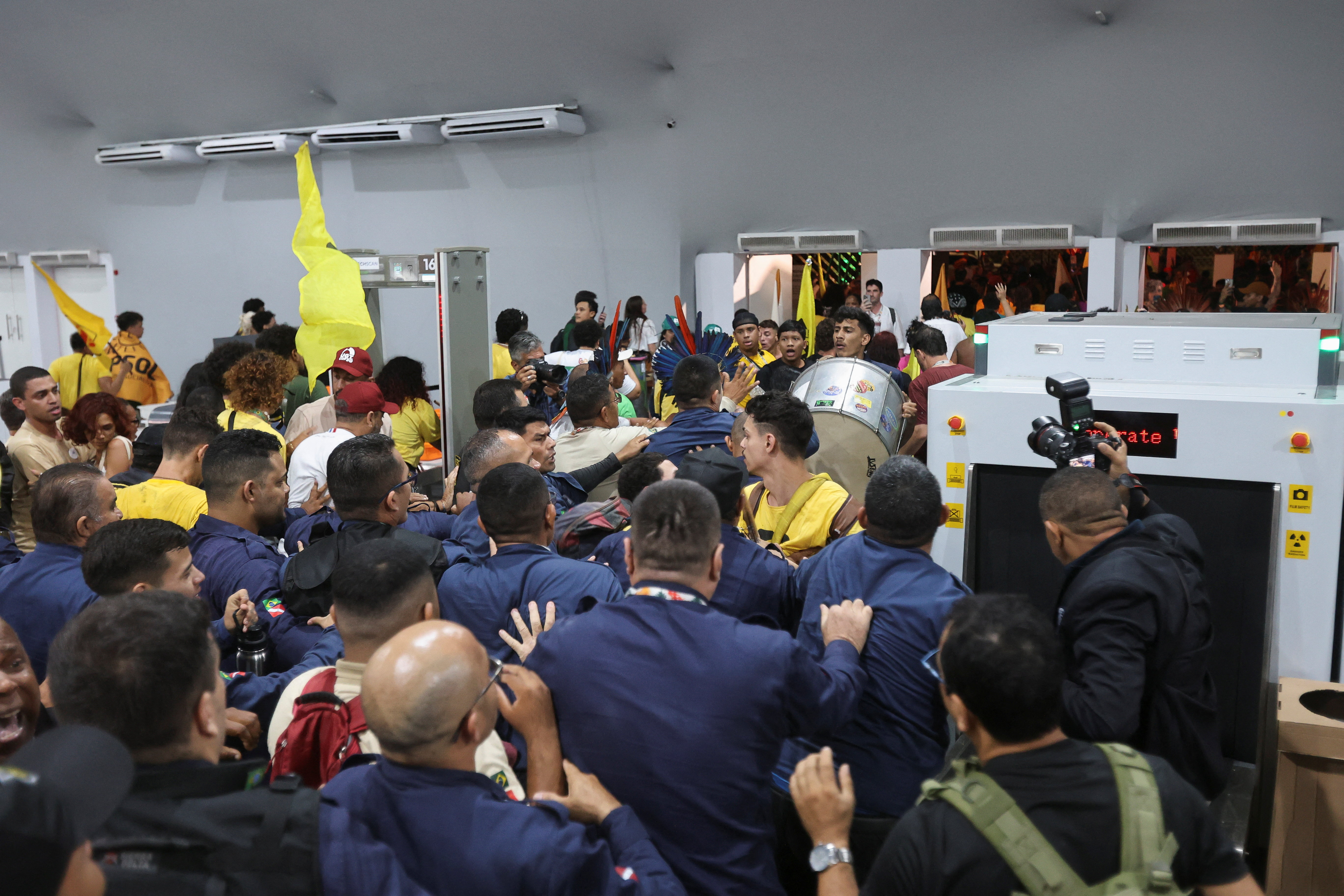 巴西貝倫舉行聯合國氣候變化大會期間,數十名原住民示威者企圖闖入峰會場地,與入口處的保安員衝突,兩名保安員受傷。
