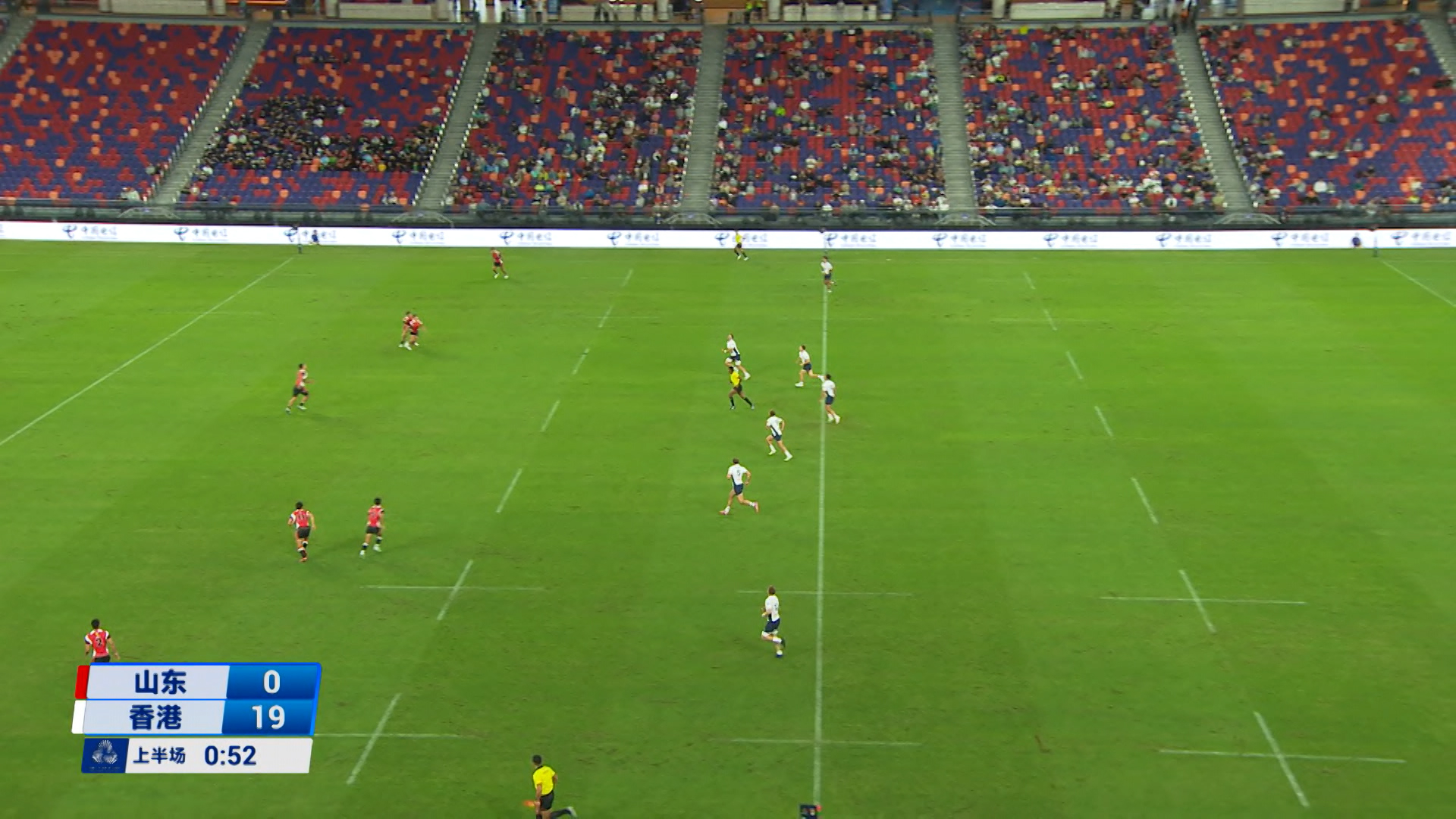 港隊將山東隊遏制在後場,拜恩塞巴及麥浚勇,各自達陣得分,拜恩菲立斯射入兩個附加罰球,港隊領先至19:0。上半場完結前,山東隊有球員達陣,之後射入附加罰球,追至7:19。