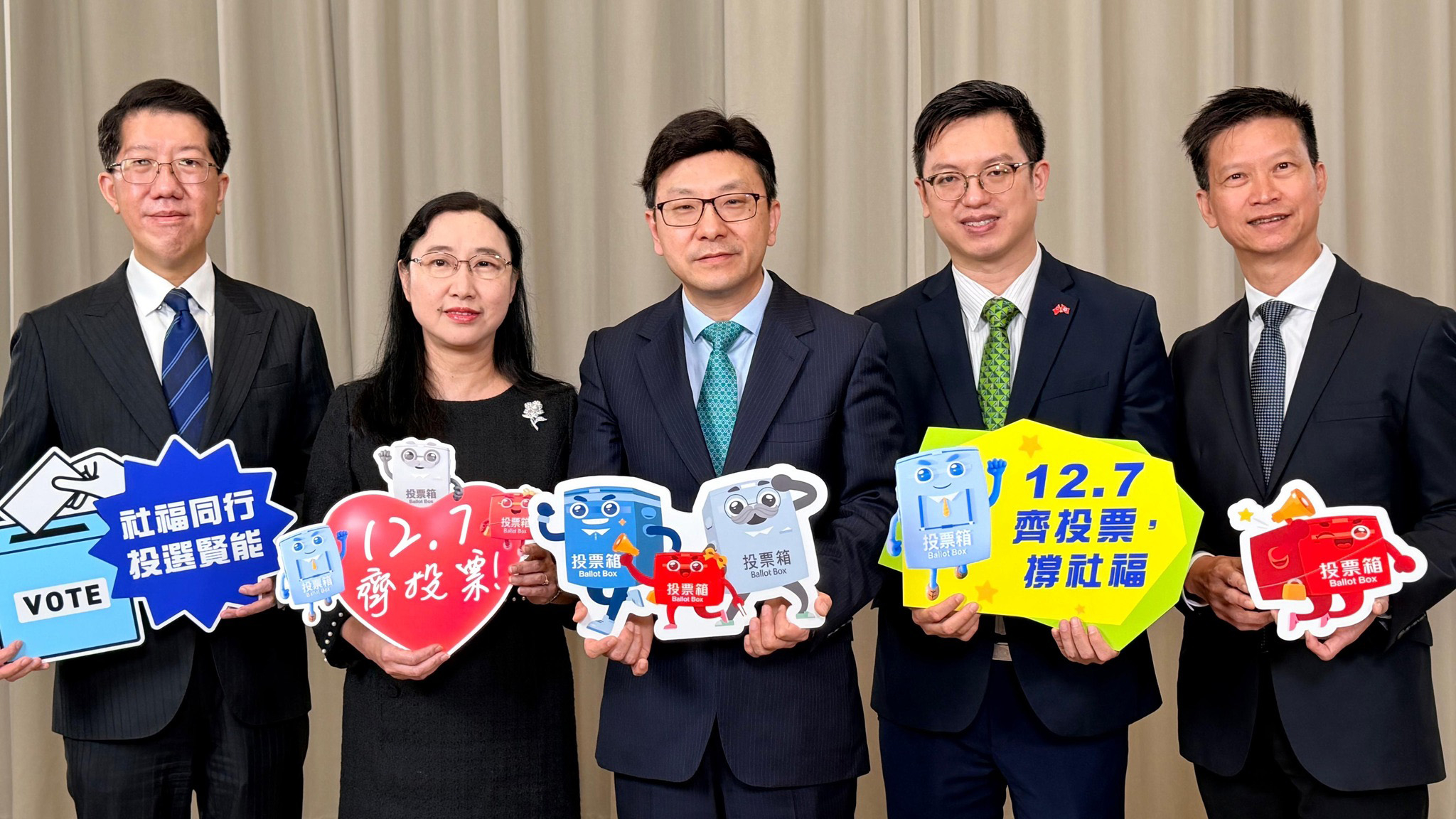 立法會換屆選舉投票將於12月7日舉行,勞工及福利局局長孫玉菡率領勞福局常秘劉焱、副局長何啟明、社署署長杜永恒及勞工處處長許澤森,一同以捲紙藝術製作選舉吉祥物「票箱寶寶」,呼籲市民履行公民責任,積極投票。