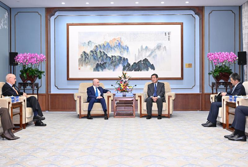 何立峰在北京會見美中關係全國委員會董事會執行副主席格林伯格及會長歐倫斯。(新華社)