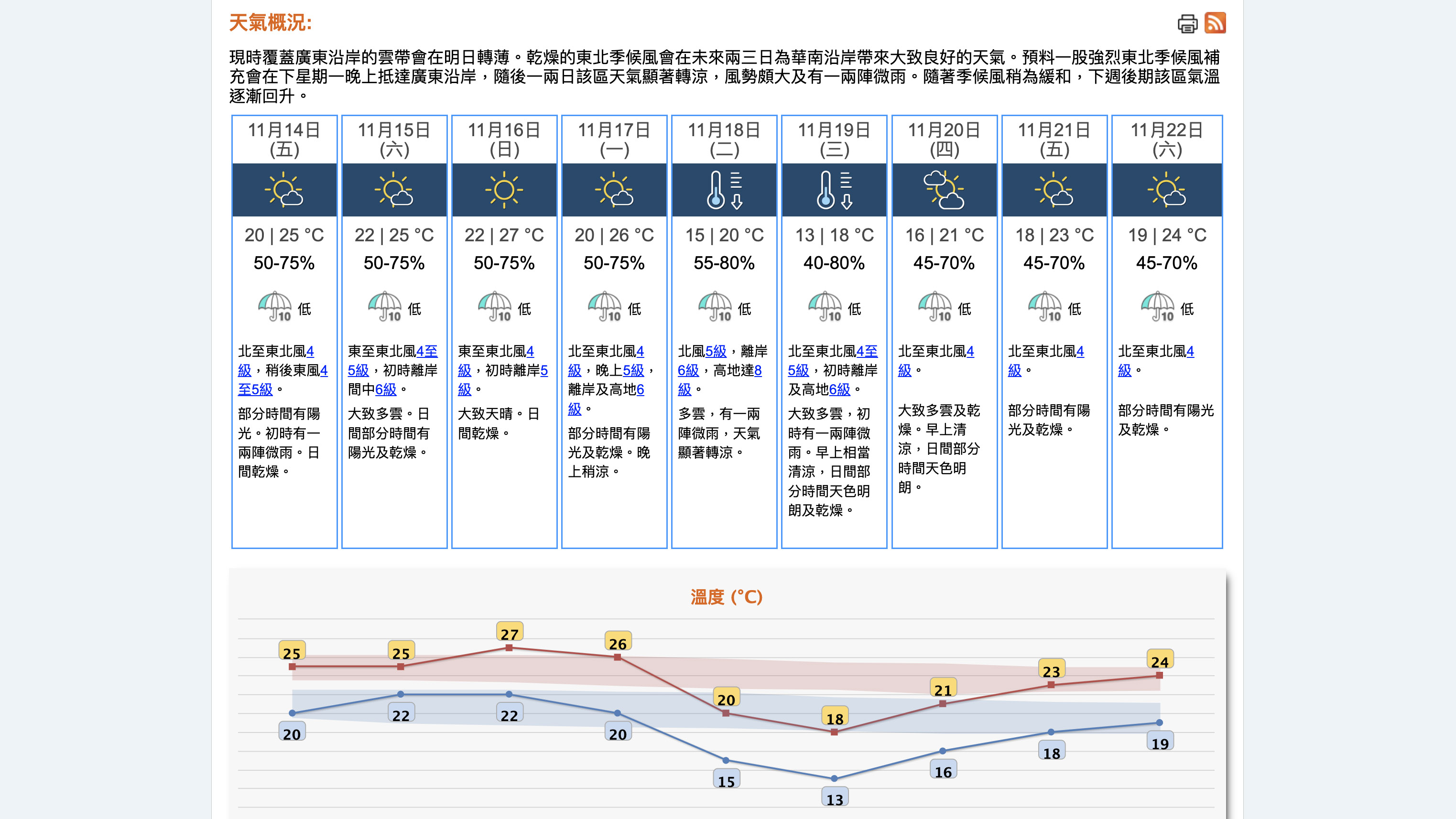 天文台表示,下星期二天氣顯著轉涼。(天文台網站截圖)