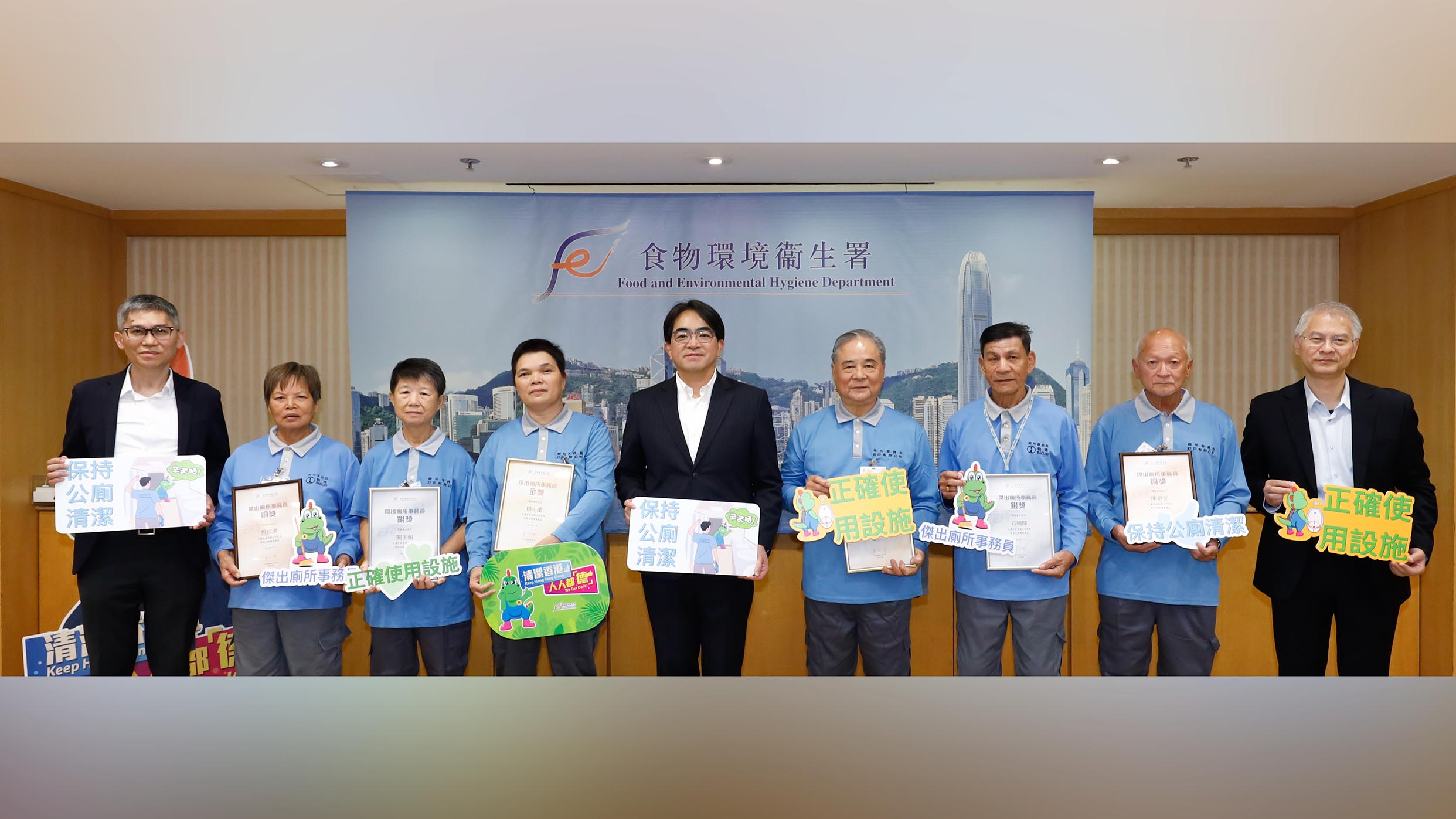 食環署署長吳文傑頒發獎項予獲選廁所事務員,讚揚他們辛勤工作、敬業樂業,確保公共廁所衛生整潔和設施運作良好,讓使用者感到滿意。