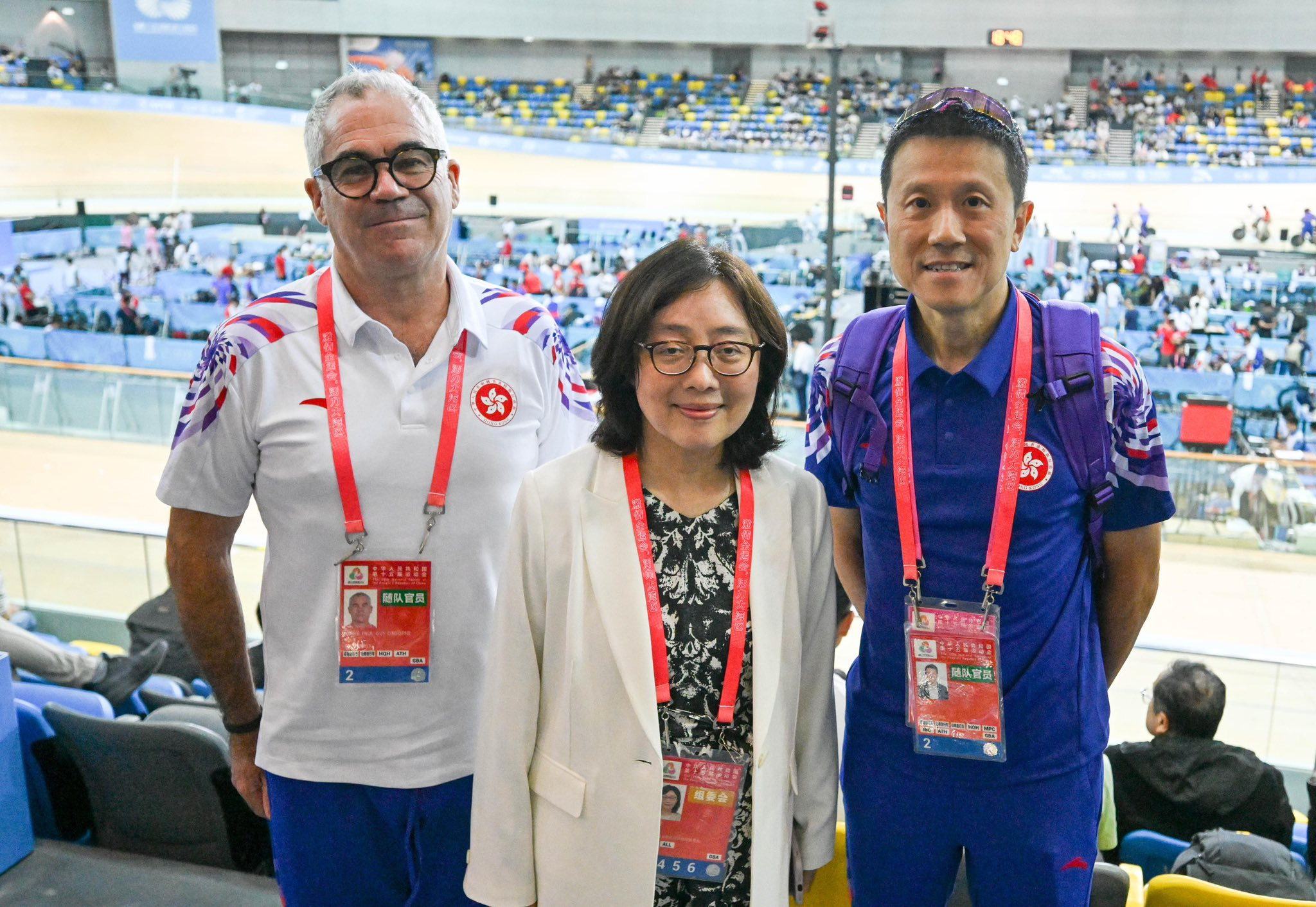 甯漢豪到訪將軍澳香港單車館,觀看全運會男子團體追逐賽決賽。(發展局社交網站)