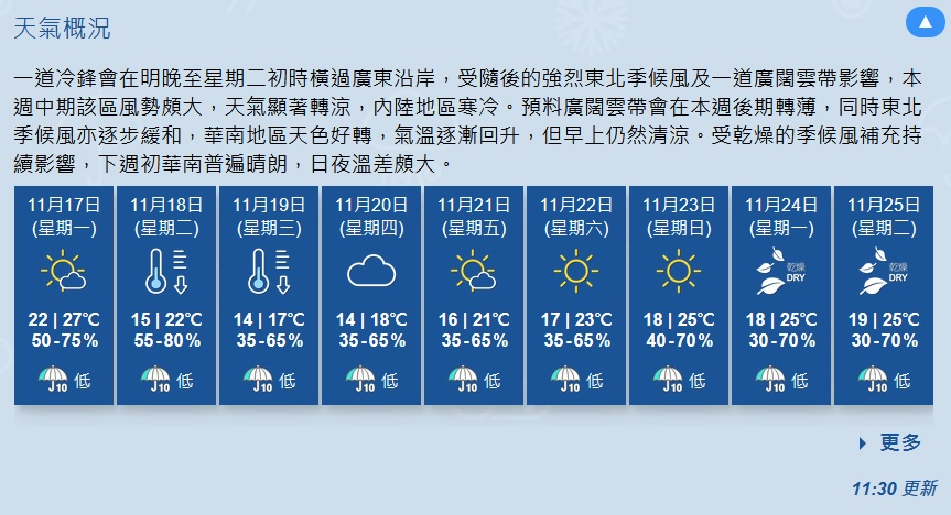 天文台預料星期二顯著轉涼,星期三市區氣溫下降至14度左右,新界部分地區寒冷。(天文台網站截圖)