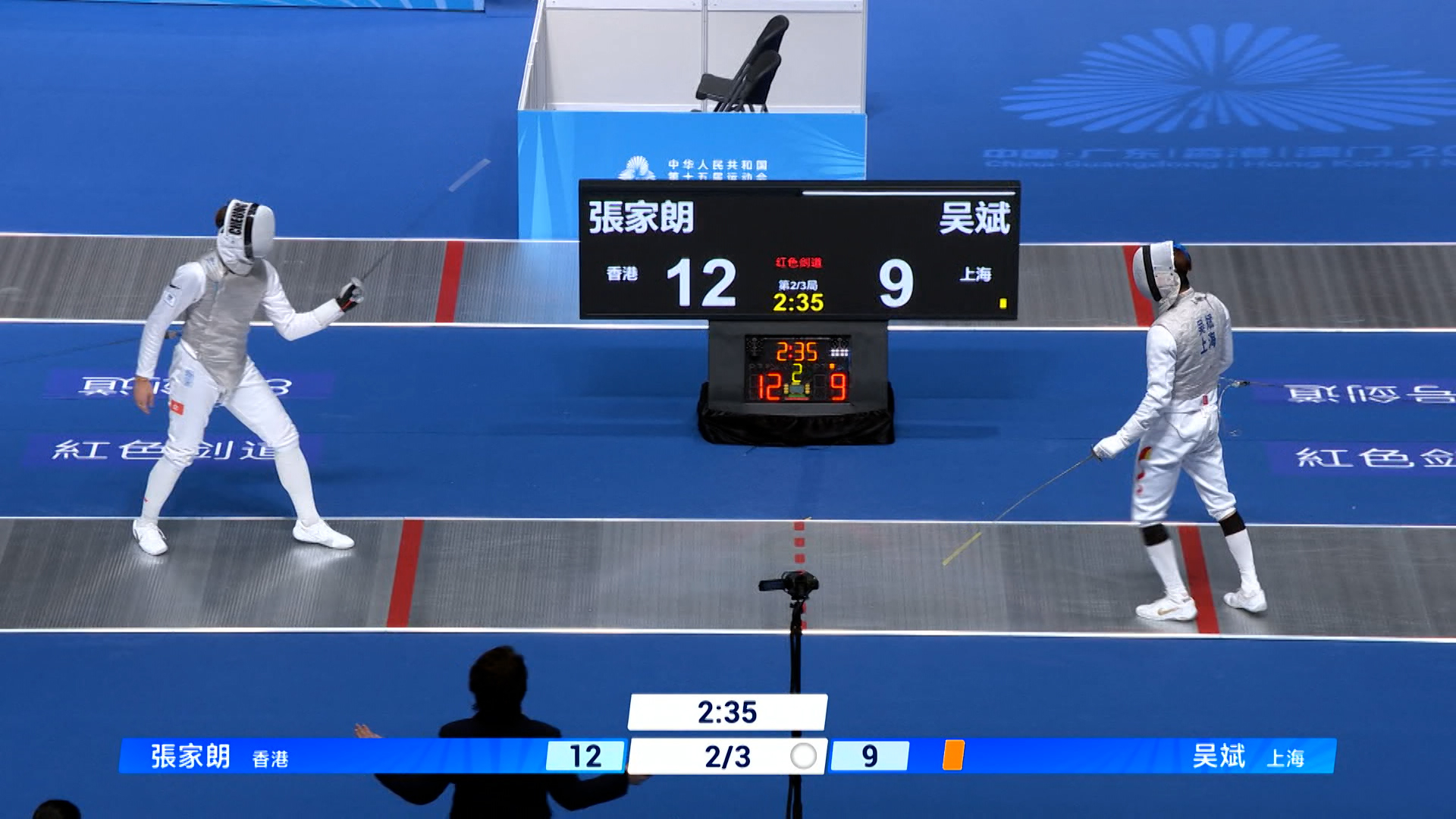 兩屆奧運金牌得主張家朗在八強面對上海劍手吳斌,初段一度稍為落後,其後反先,並一度擴大領先優勢至9:6,第一節完,張家朗領先10:8。進入第二節,張家朗先取一劍,之後兩人分數拉鋸,稍為佔先的張家朗最終以15:12勝出。