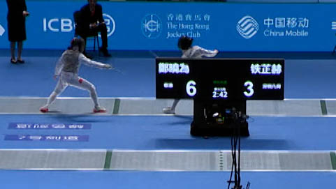 鄭曉為在32強面對深圳幾何國際擊劍俱樂部代表鐵芷赫。