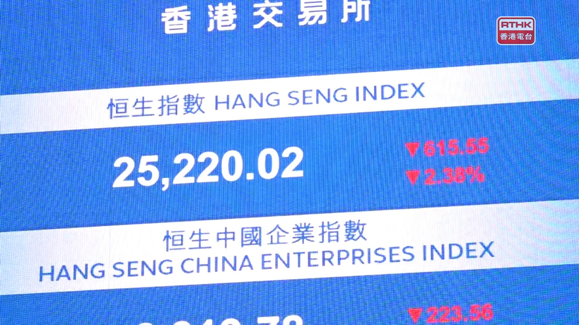 恒生指數低開逾370點後,跌幅一度擴大至近660點,低見25178點,收市報25220點,跌615點,跌幅近2.4%,主板成交額2857億元。