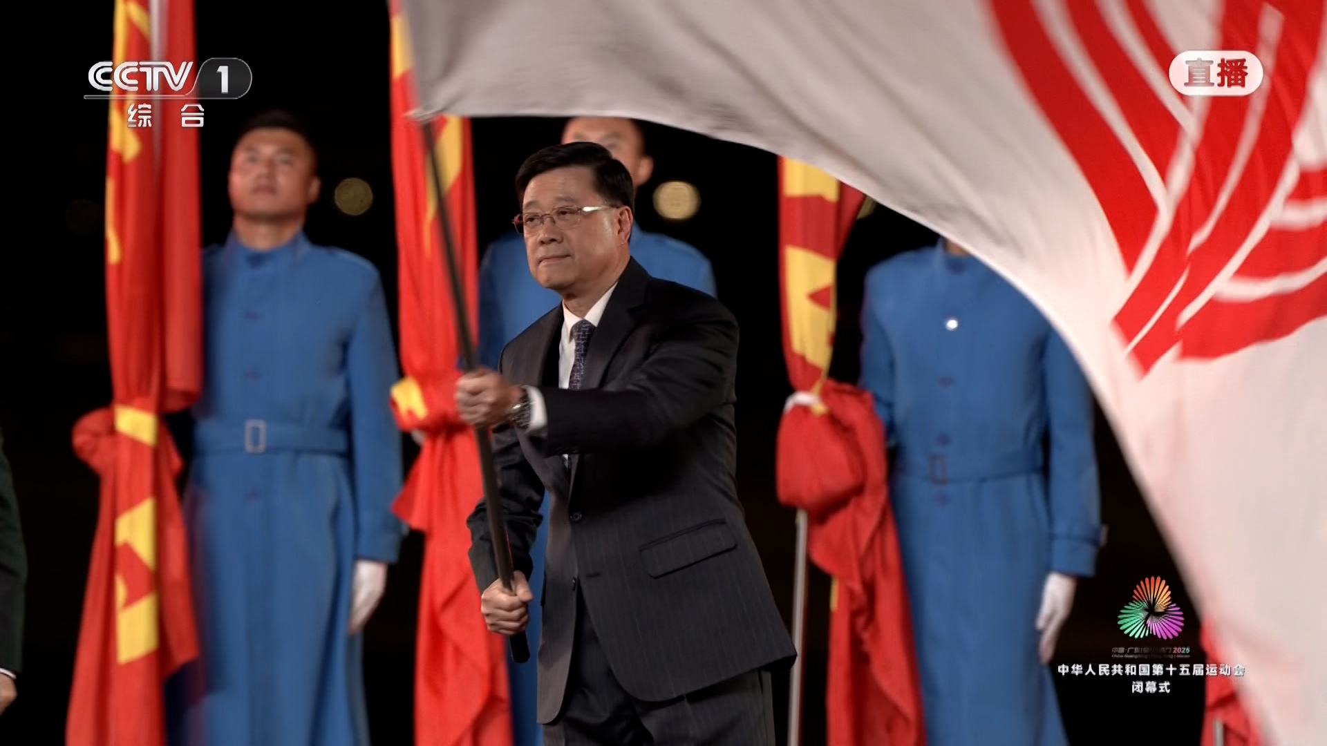 行政長官李家超晚上到深圳出席十五運會閉幕式,並聯同廣東省省長孟凡利和澳門特區行政長官岑浩輝一同將全運會會旗交接予下一屆全運會主辦方湖南省。李家超感謝全國政協主席王滬寧親自出席,並感謝中央信任,感謝國家體育總局堅實支持,廣東、香港和澳門三地同心,首次共同承辦全運會,攜手呈獻了這場「簡約、安全、精彩」的體育盛會,共同譜寫大灣區融合發展新篇章。