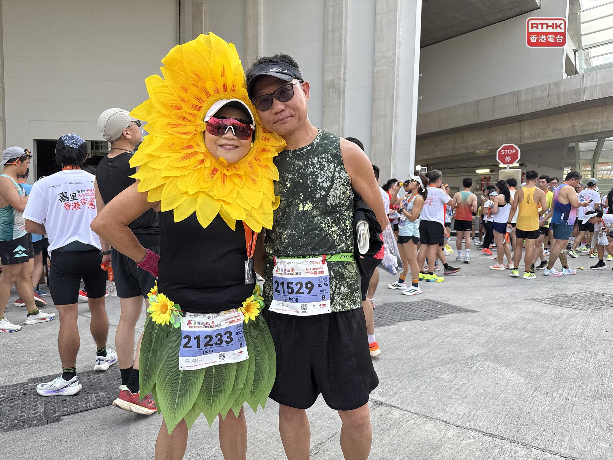 香港街馬今日舉行,大批參與全馬和半馬組別的跑手,早上7時許後陸續抵達終點。有跑手表示,過去幾年均以不同造型參加,今年打扮成太陽花,希望為沿途市民帶來陽光和活力,給予太陽般的能量,令自己和其他參加者開心。她又說,最後中九龍繞道油麻地段隧道出口的上斜路段是「魔鬼跑道」,非常辛苦,期間她不斷為其他跑手加油打氣,又指今年氣氛很好,人數較以往多。