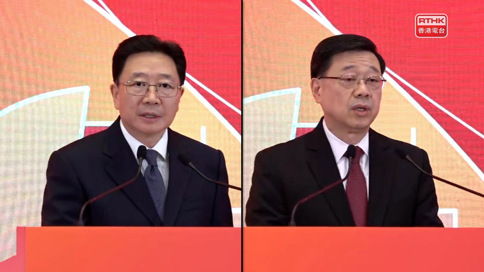 周霽(左)指中央宣講團成員來港,將為更深入學習理解貫徹落實四中全會精神帶來權威解。李家超(左)指充分體現中央對香港的高度重視。(陳感恩攝)