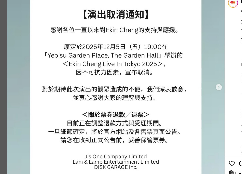 鄭伊健的經理人公司在社交網站宣布,因不可抗力因素,取消原訂12月5日晚上在東京舉行的演唱會,對期待今次演出的觀眾造成不便深表歉意,將盡快於官方網站和各售票頁面公布退款安排,呼籲經官方平台購票的觀眾保留原有門票,以便跟進。