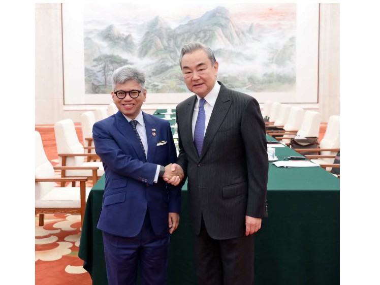 中共中央政治局委員、中央外辦主任王毅在北京會見來華出席中馬海上問題雙邊對話第二次會議的馬來西亞國家安全委員會主任努西爾萬。