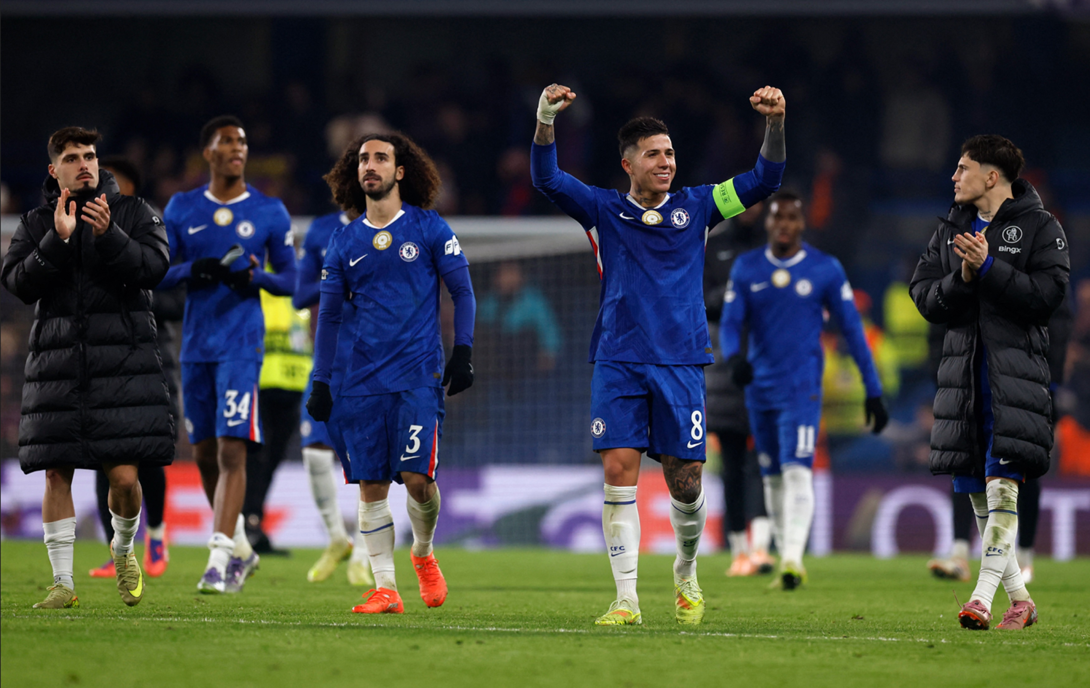 車路士球員慶祝球隊取勝。(路透社)