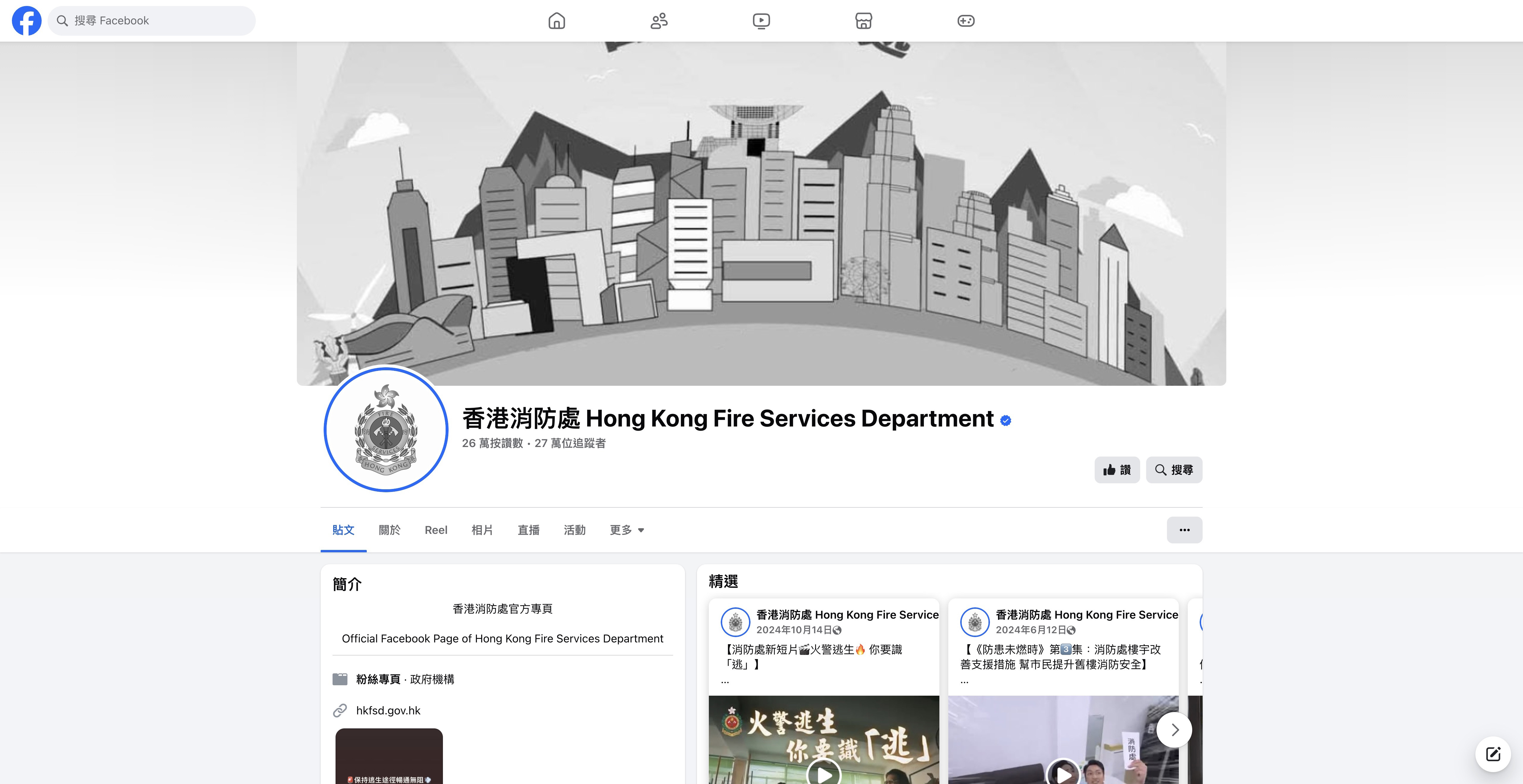 消防處的Facebook社交專頁,大頭貼及封面相片轉為黑白色。(消防處社交網站截圖)